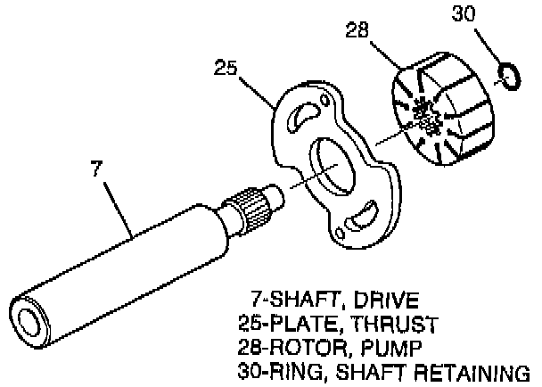 9. Pump rotor (28) and thrust plate (25) from drive shaft (7).