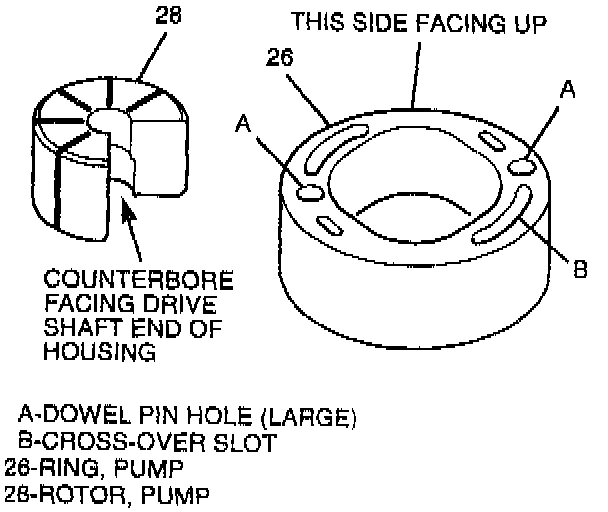 7. Pump ring (26), with holes positioned correctly onto dowel pins (6), in pump housing (10).