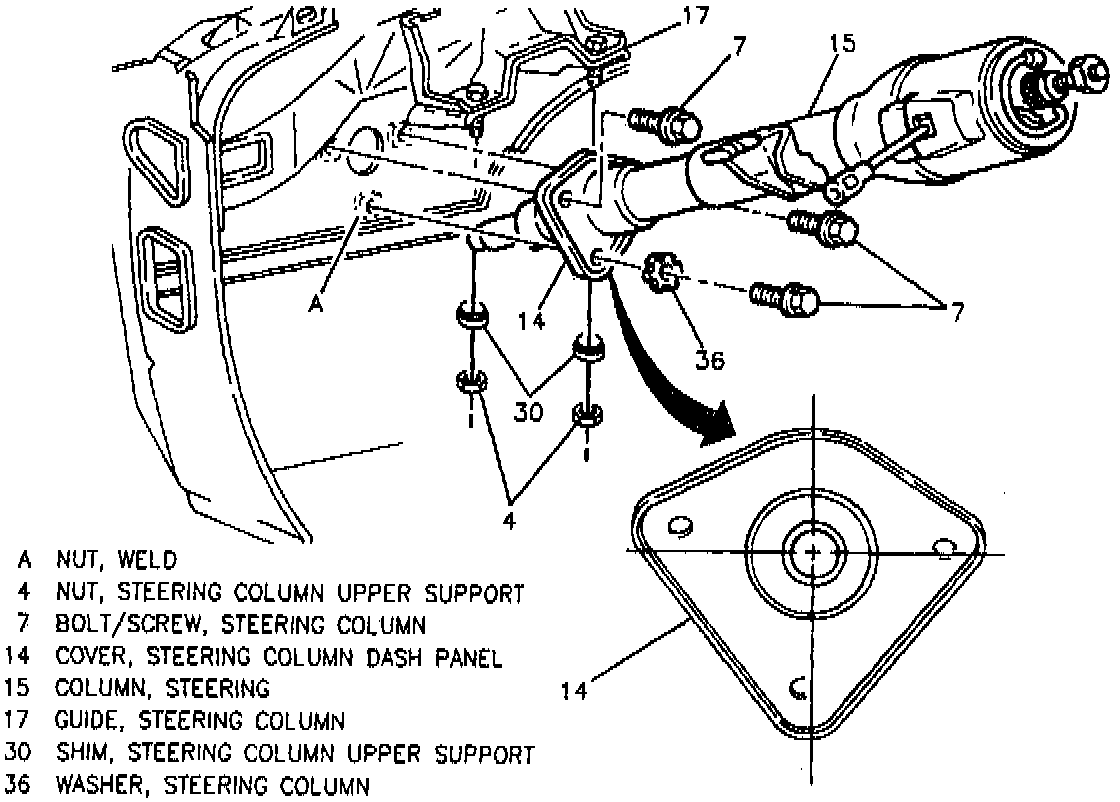 3. Shims (30) and nuts (4) to steering column support.