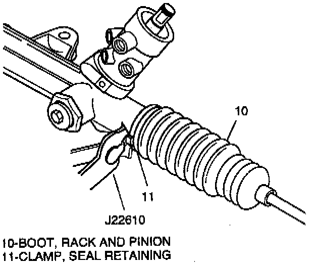 1. New seal retaining clamp (11) onto rack and pinion boot (10).