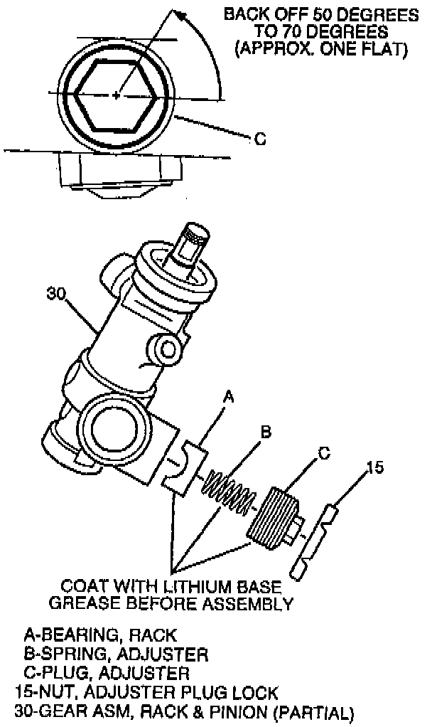 2. Loosen adjuster plug lock nut (15) and turn adjuster plug clockwise until it bottoms in gear assembly (30), then back off 50� to 70� (approximately on flat).