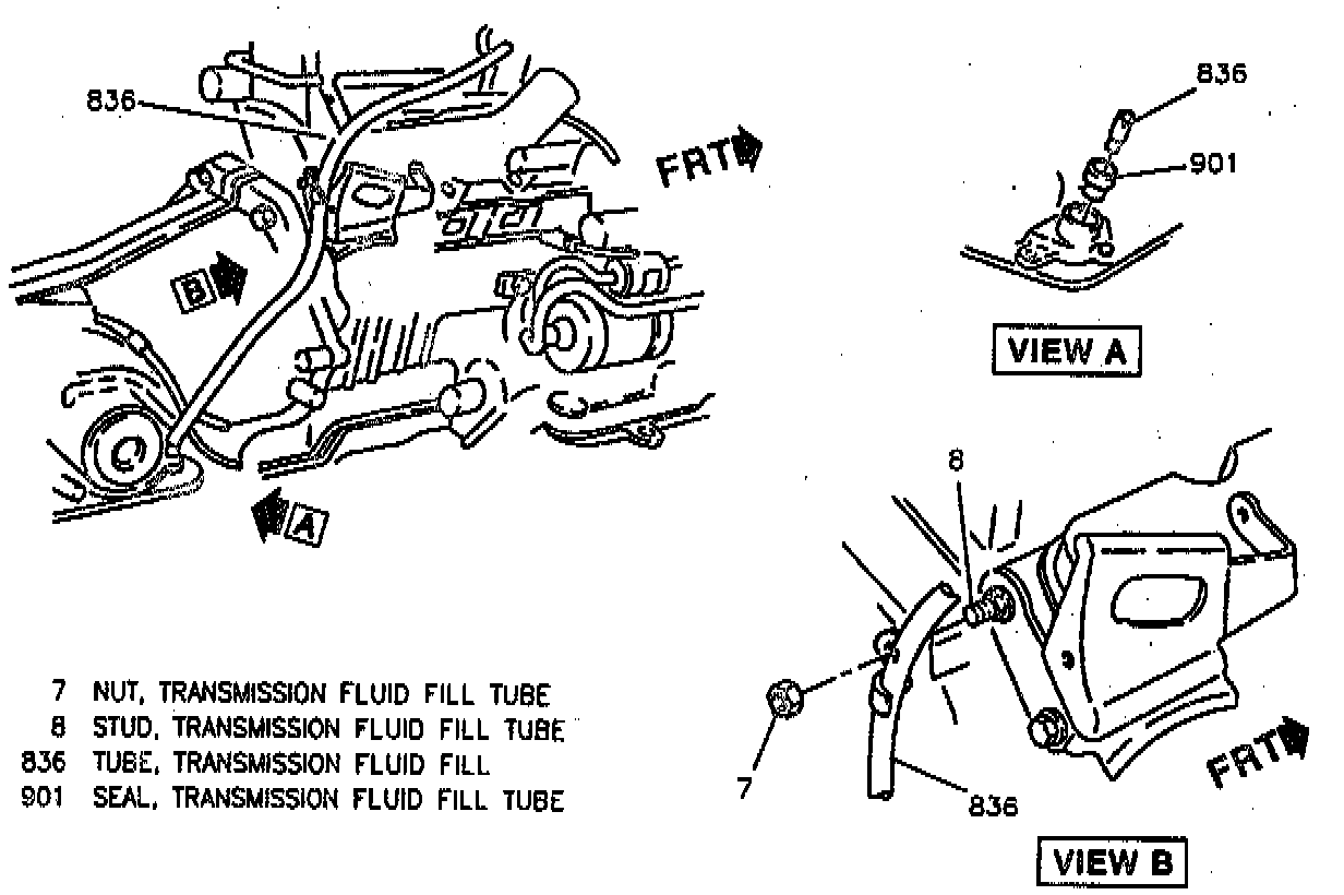 1. Fill tube seal (901) and fill tube (836) through engine compartment to transmission.