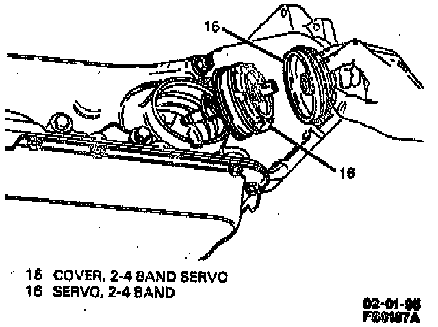 9. Two automatic transmission oil pan bolts/screws from below servo cover (15).