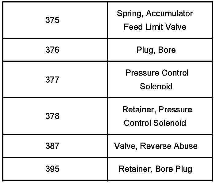 If the valve body has been contaminated with debris from another transmission component failure, then disassemble all bores for complete cleaning of all valve body components. If possible, keep individual bore parts separated for ease of reassembly. Use the illustrations in this bulletin for a positive identification and location of individual parts: