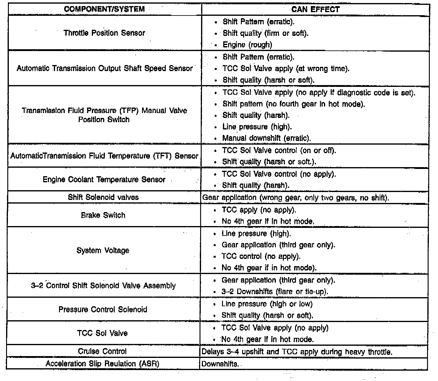 This table gives some general information about electronic component malfunctions. Use this information to become familiar with possible conditions caused by transmission/vehicle electrical components. Refer to the Diagnosis Charts for more specific information.