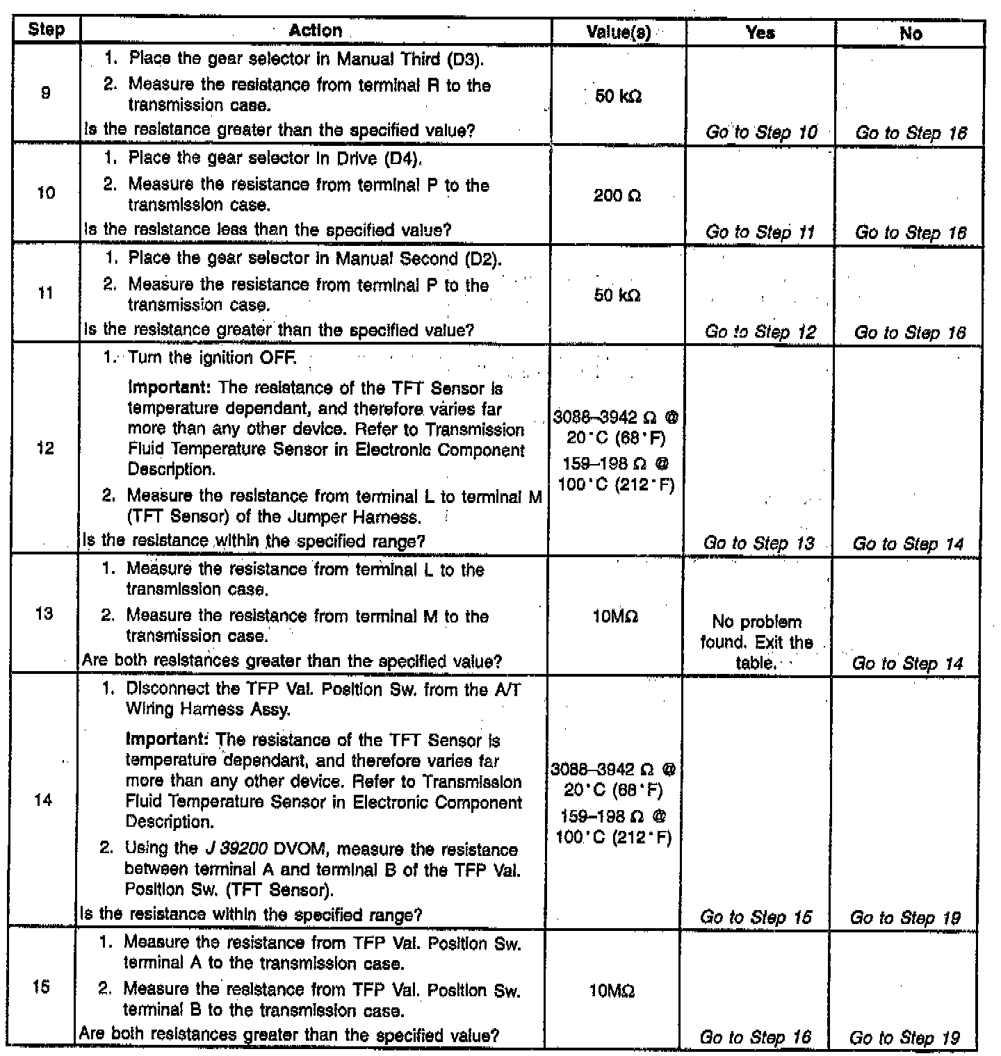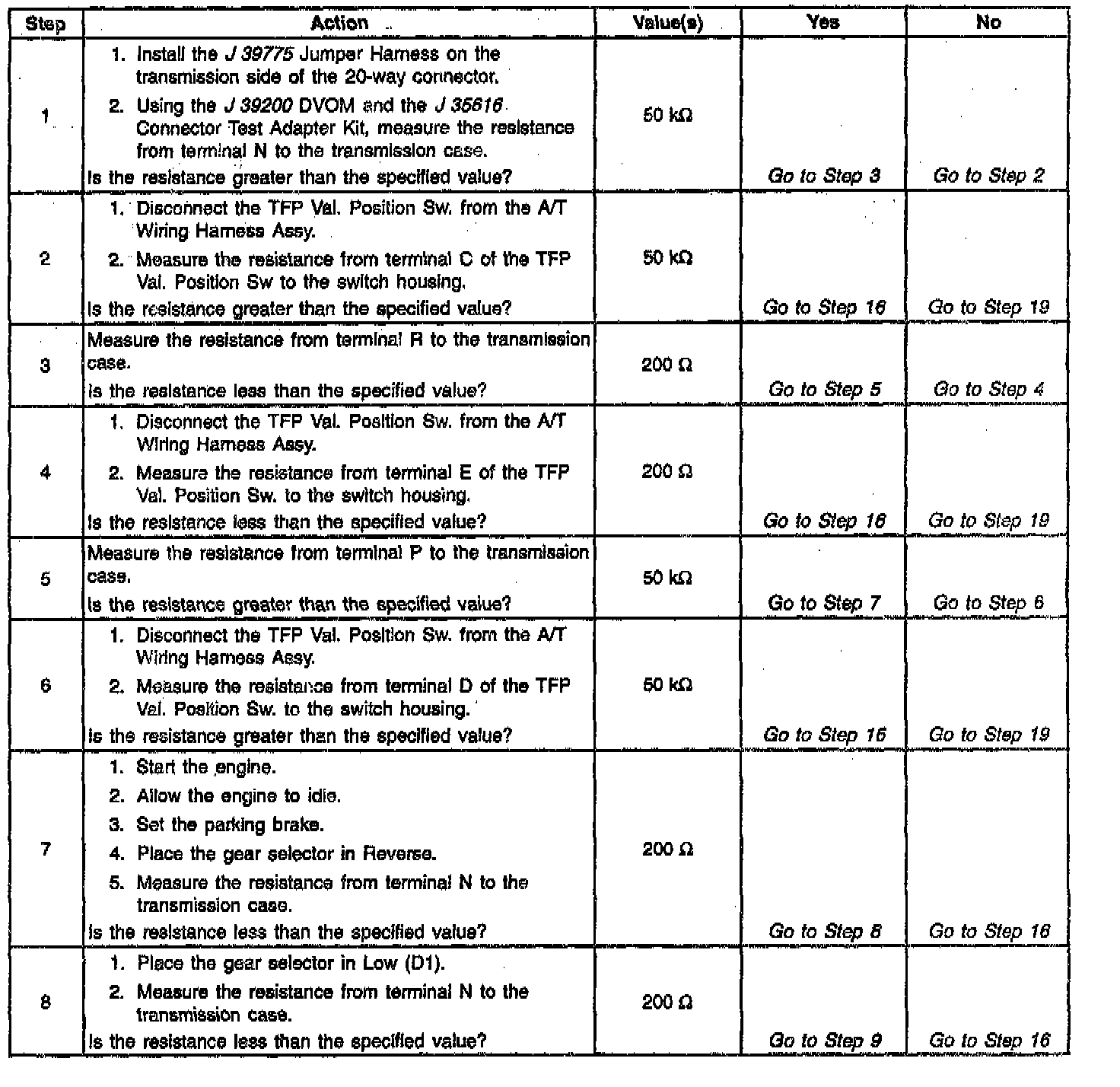 Important: This procedure tests the Automatic Transmission Fluid Pressure Manual Valve Position Switch (TFP Val. Position Sw.) circuits and the Automatic Transmission Fluid Temperature (TFT) Sensor circuit. Do not use this procedure to test other Automatic Transmission circuits, refer to 4L60-E Automatic Transmission internal Wiring Harness check. Wiring Harness Check