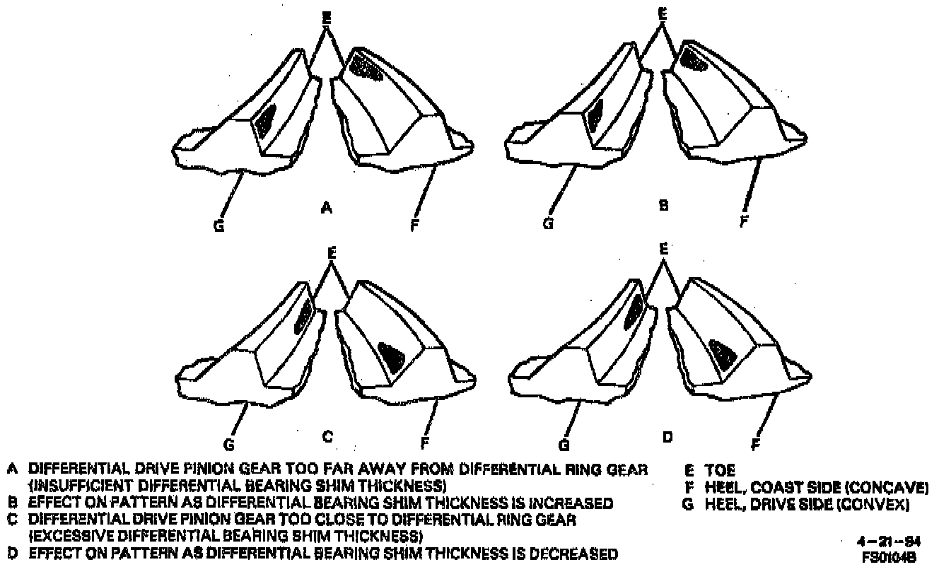When the differential drive pinion gear is too close to the centerline of the differential ring gear, the pattern will be a low toe contact on the drive side, and a low heal contact on the coast side. Moving the differential drive pinion gear farther away from the differential ring gear by increasing backlash will cause low toe contact on the drive side to move up and toward the heel the low heel contact on the coast side will move up and toward the toe.