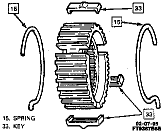 - Engage tang end of each spring in same synchronizer key, but in position open end of springs opposite of each other.