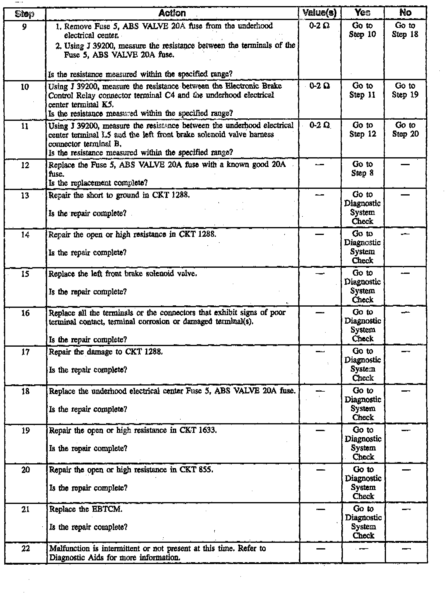 This DTC identifies a brake solenoid valve that cannot be energized. The malfunction may be due to an open in its circuitry, or is always energized due to a short to ground in its circuitry between the driver and the brake solenoid valve. An open will not allow proper ABS operation, but the short to ground simply turns on the brake solenoid valve. A path for base brakes is still allowed once the motor rehomes and the check ball is lifted off its seat during key to RUN initialization.