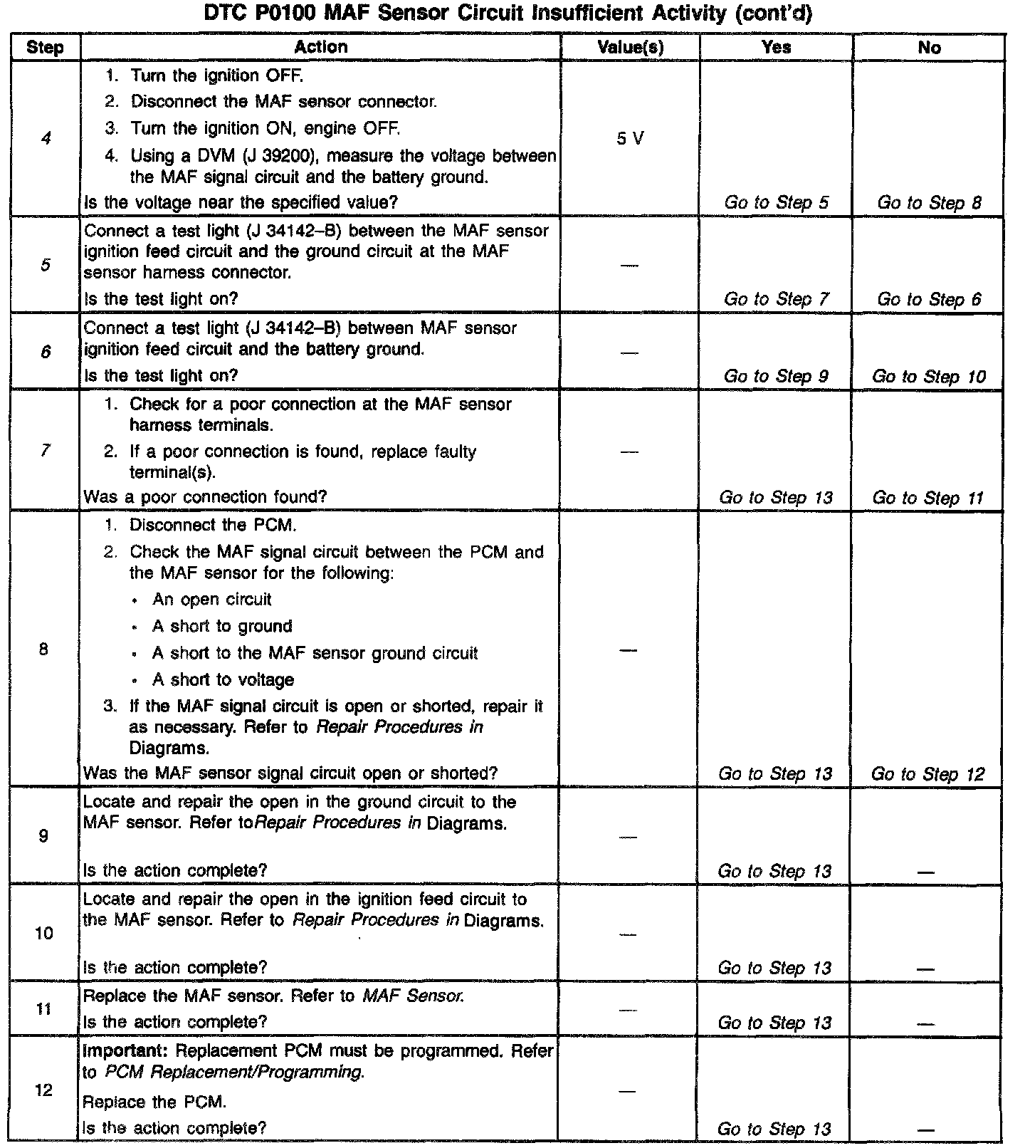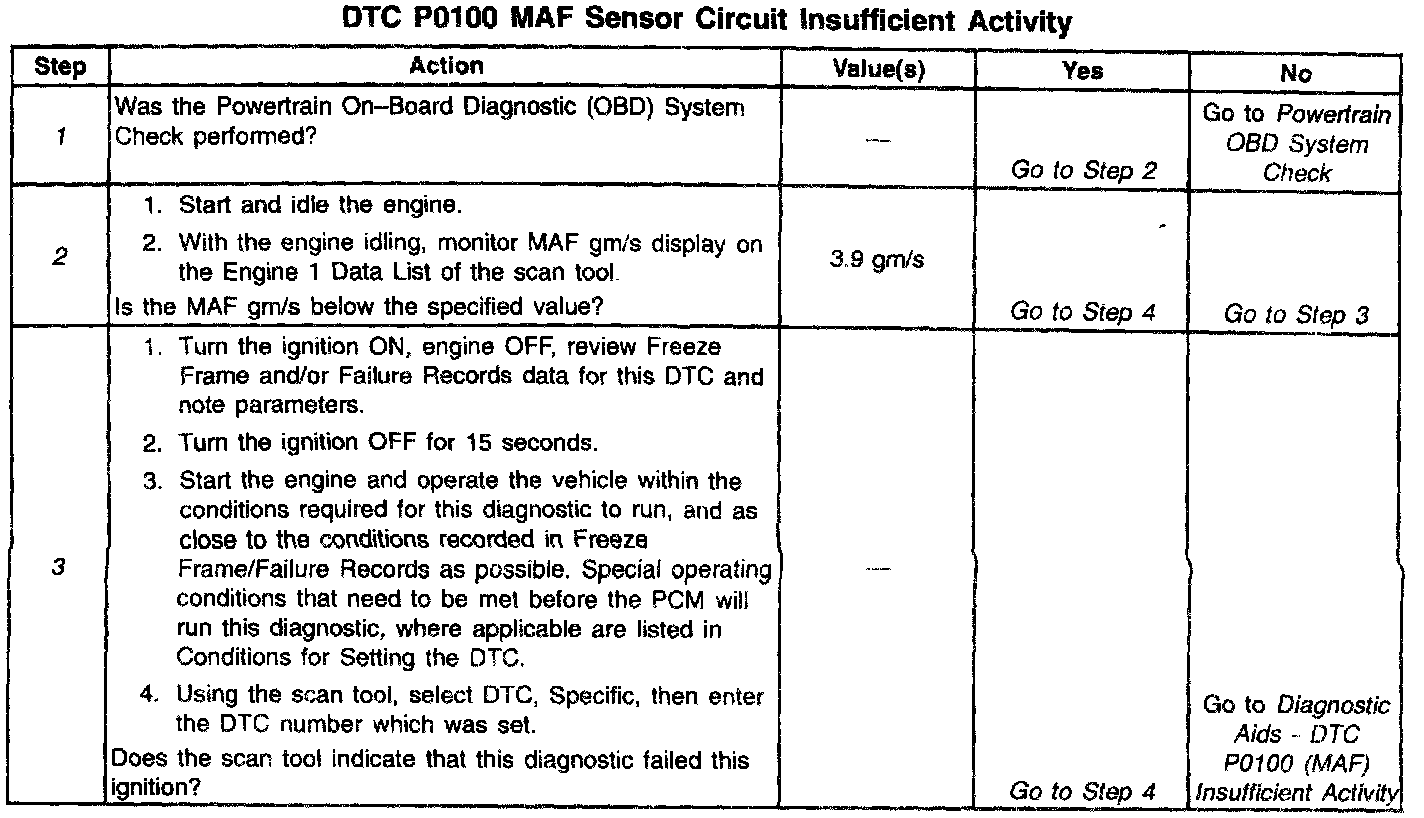 The PCM monitors the MAF sensor frequency and can determine if the sensor is stuck low, stuck high, not providing the airflow value expected for a given operating condition, or that the signal appears to be stuck based on a lack of signal variation expected during normal operation. This diagnostic checks for a stuck MAF sensor signal. If the MAF sensor frequency varies less than a predetermined minimum amount, this DTC will set.