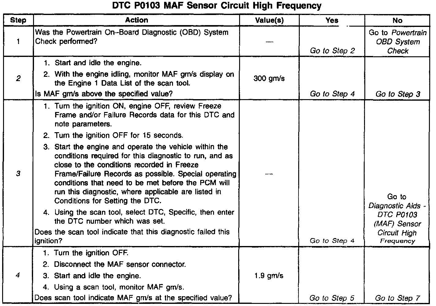 The MAF sensor used on this vehicle is a hot wire type and is used to measure air flow rate. The MAF output frequency is a function of the power required to keep the airflow sensing elements (hot wires) at a fixed temperature above ambient temperature. Air flowing through the sensor cools the sensing elements. The amount of cooling is proportion a to the amount of air flow. As air flow increases, a greater amount of current is required to maintain the hot wires at a constant temperature. The MAF sensor converts the changes in current draw to a frequency signal read by the PCM. The PCM calculates air flow (grams per second) based on this signal.