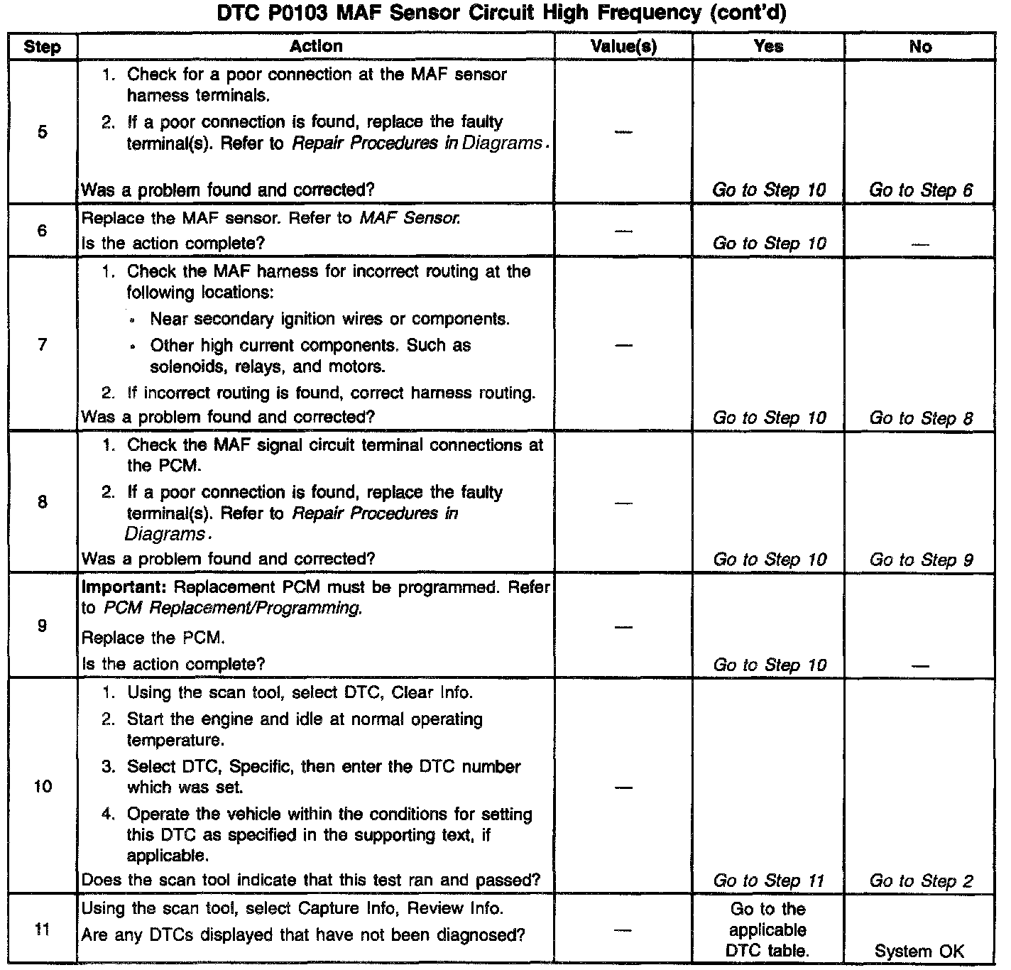The PCM monitors the MAF sensor frequency and can determine if the sensor is stuck low, stuck high, not providing the airflow value expected for a given operating condition, or that the signal appears to be stuck based on a lack of signal variation expected during normal operation. This diagnostic checks for too high an airflow rate. When the PCM detects that the MAF sensor grams per second is above a predetermined value this DTC will set.