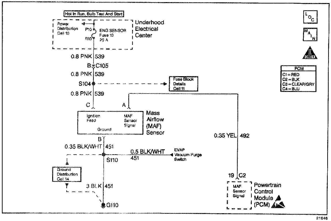 The Mass Air Flow (MAF) sensor measures the amount of air that is ingested by the engine. Direct measurement of air entering the engine is more accurate than calculating airflow from Manifold Absolute Pressure (MAP), Intake Air Temperature (IAT) and RPM (speed/density). The MAF sensor has a battery feed, ground and signal circuit.