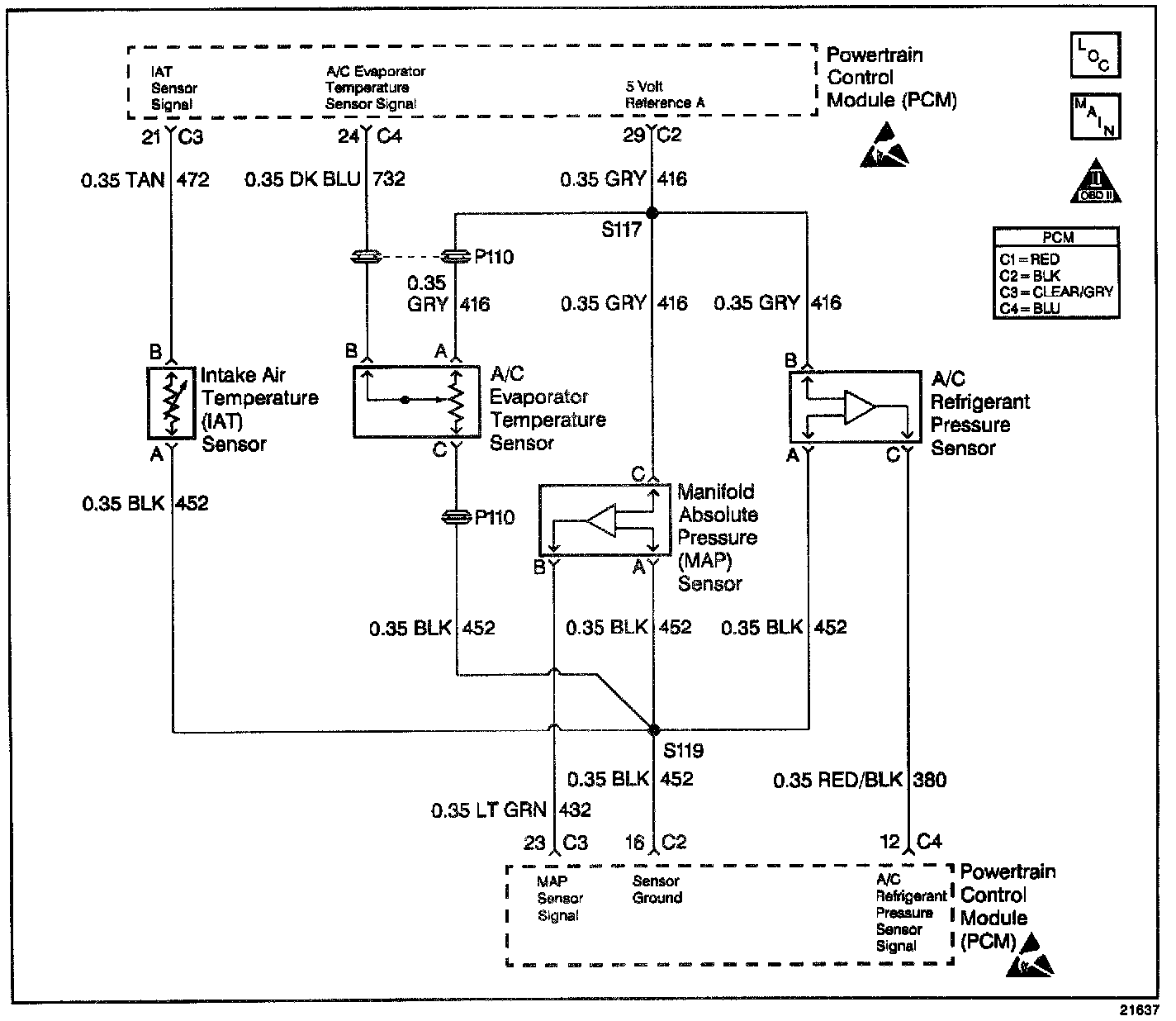 When the intake air is cold, the sensor (thermistor) resistance is high, and the PCMs signal voltage is only pulled down a small amount through the sensor to ground. Therefore, the PCM will sense a high signal voltage (low temperature). When the intake air is warm, the sensor resistance is low, and the signal voltage is pulled down a greater amount. This causes the PCM to sense a low signal voltage (high temperature).
