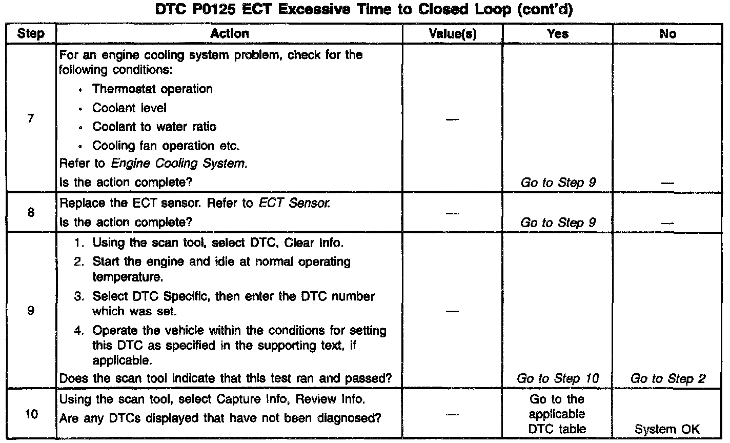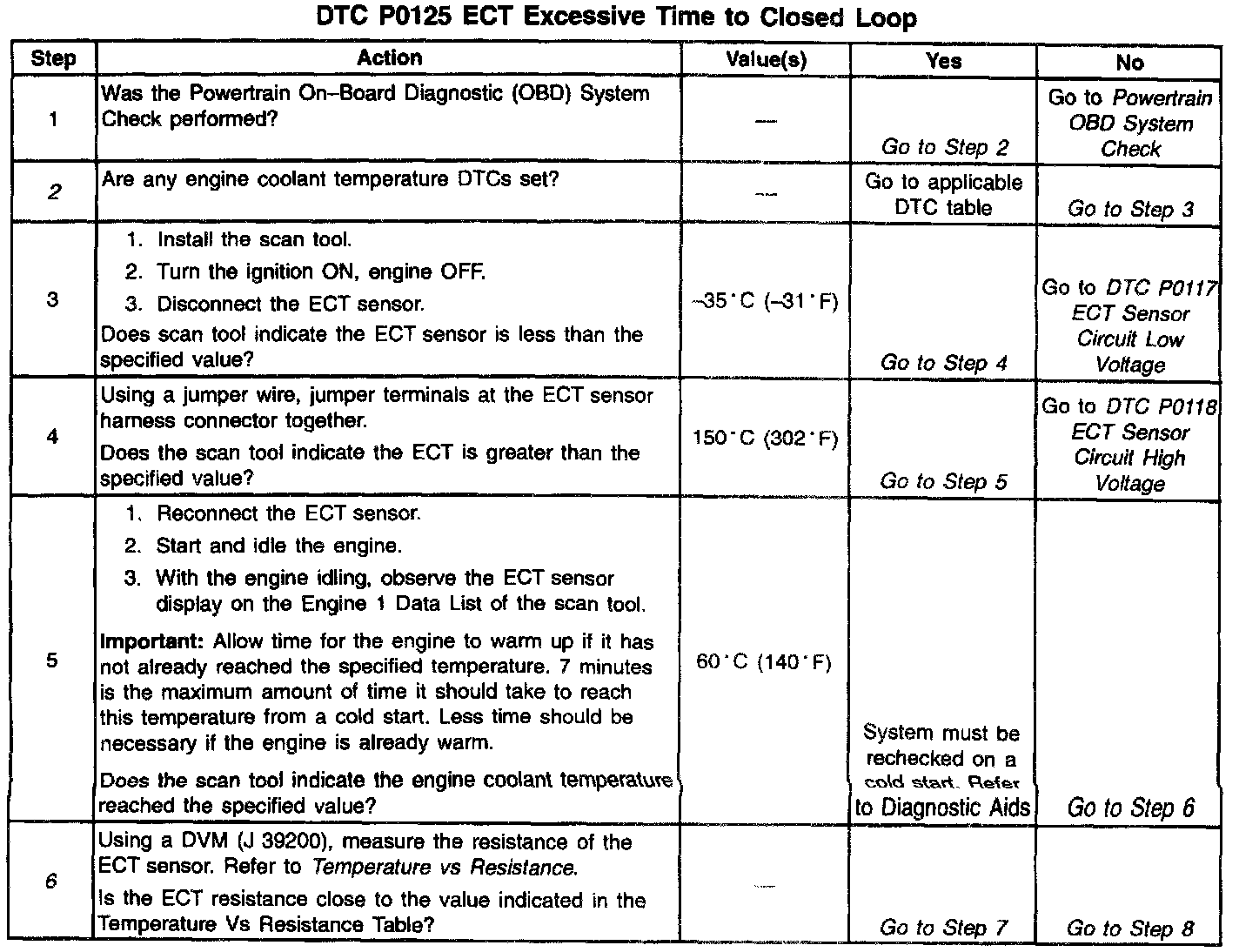 While the engine is warming, the PCM monitors the Engine Coolant Temperature (ECT) sensor to determine how long it takes the engine to reach the coolant temperature required for Closed Loop operation. DTC P0125 will set if the PCM determines that the engine does not reach Closed Loop temperature in a specified amount of time. This test will not run if either the intake air or engine coolant temperature is too low at start up. The PCM will only run this DTC on a cold start and only once per cold start.