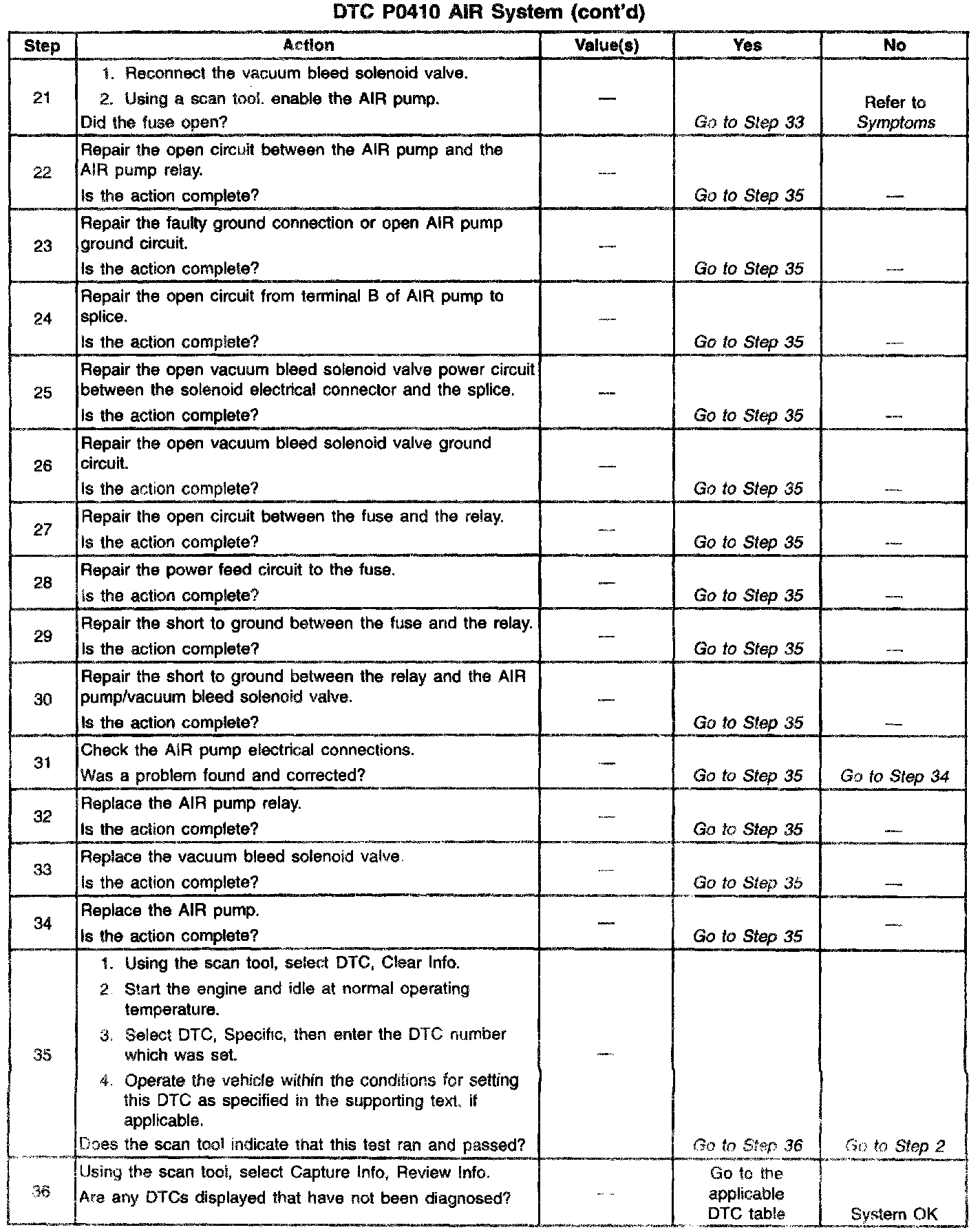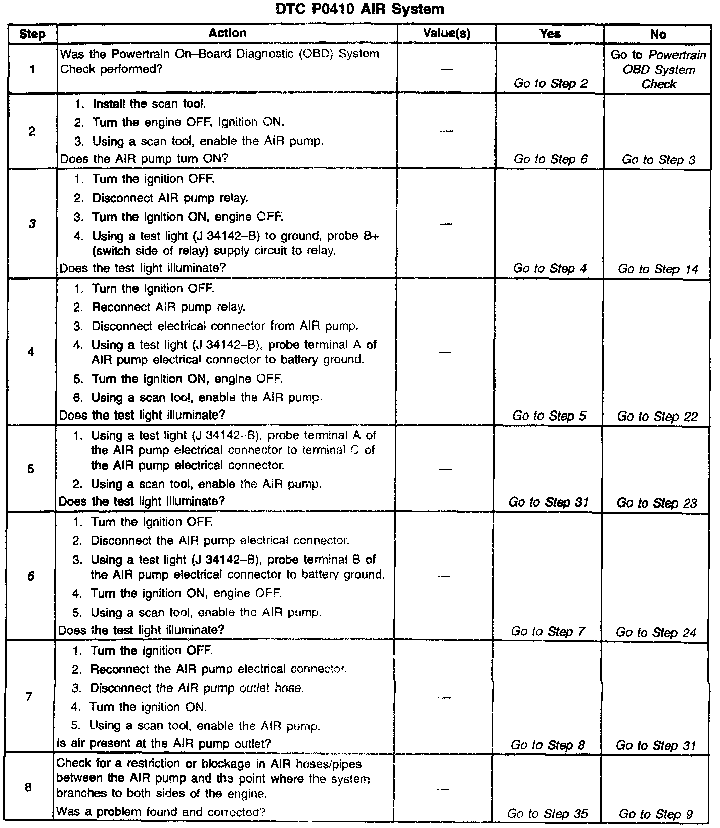 If the PCM determines that the HO2S voltages for both banks did not respond as expected during the tests, DTC P0410 will set. If only one sensor responded, the PCM will set either a DTC P1415 or P1416 to indicate on which bank the AIR system is inoperative.