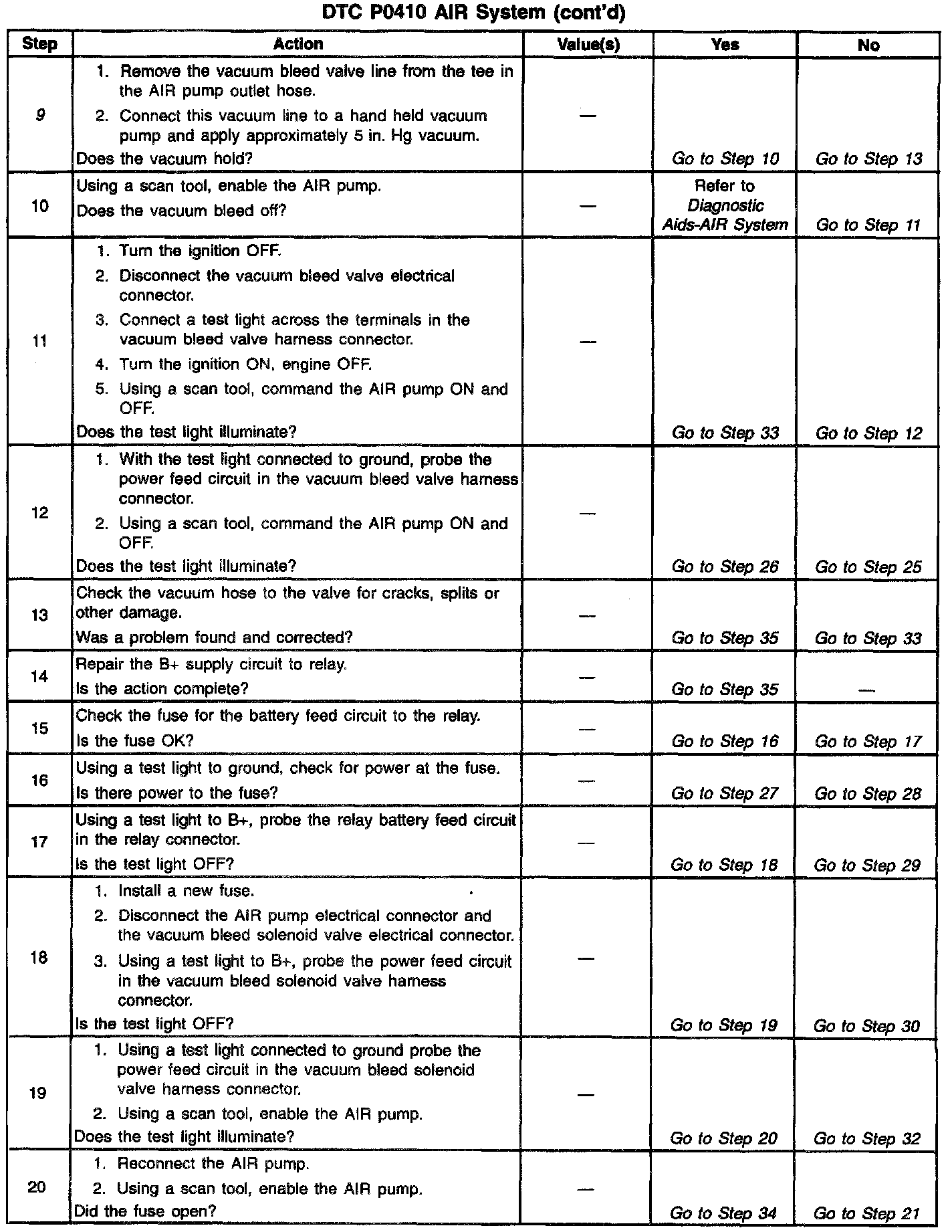 9. This step begins a test of the vacuum bleed portion of the system. Normal engine operation can cause vacuum to build up within the AIR pipes and hoses. If there is vacuum present in the system when the PCM commands the AIR pump ON, the integral stop valve within the AIR pump may not be able to overcome this vacuum and no air will enter the system. The AIR vacuum bleed solenoid valve is designed to open whenever the AIR pump is commanded ON, to eliminate this problem.