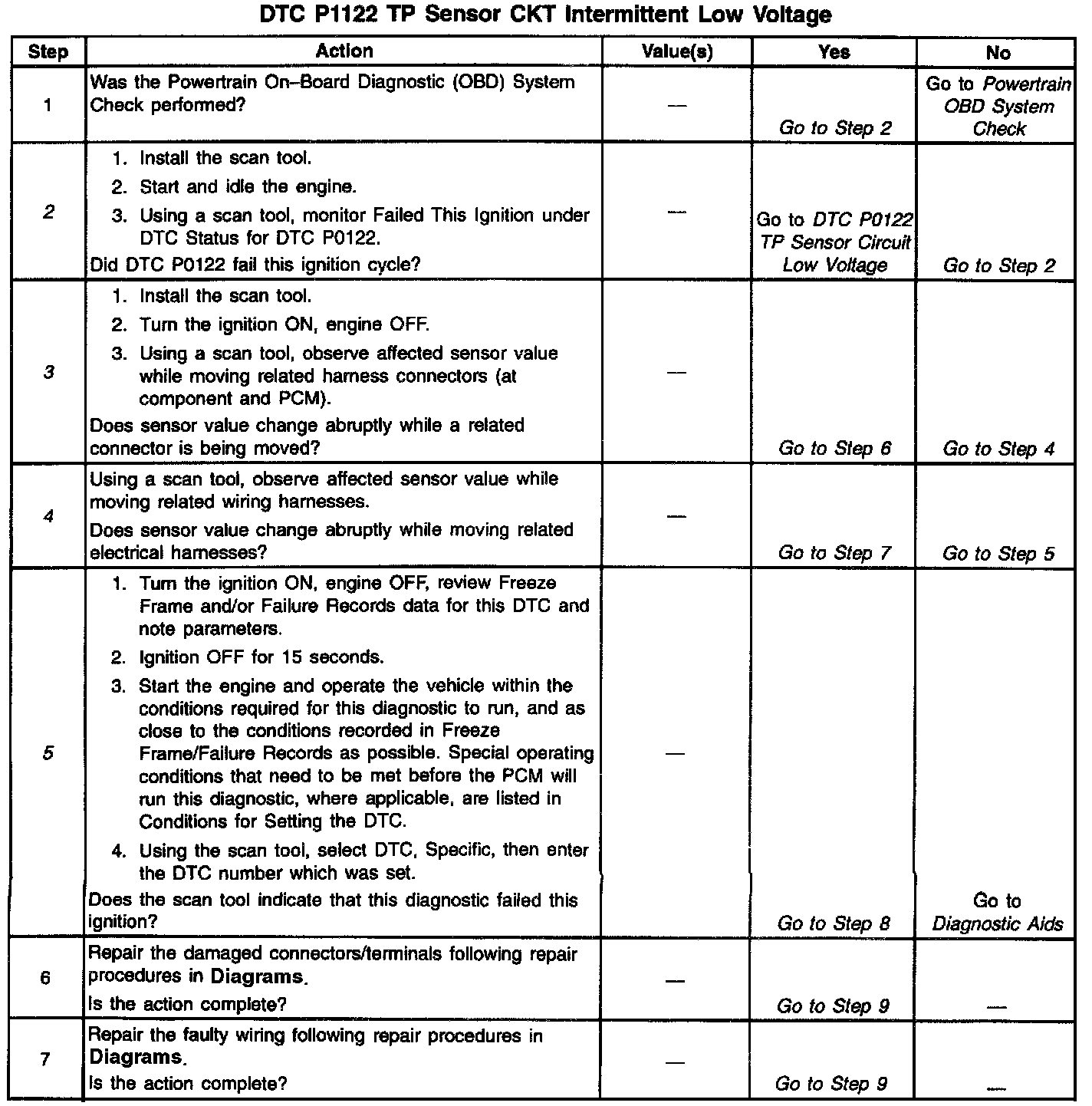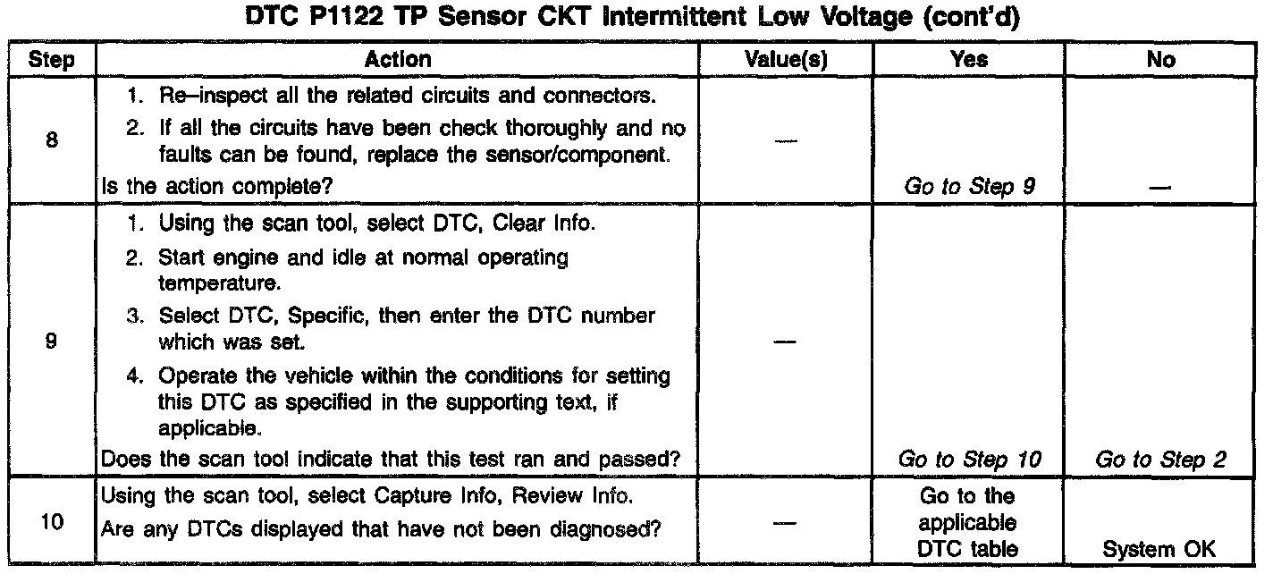 2. If DTC P0122 failed this ignition, indicates a hard failure is present. When a hard failure is present, both the hard and intermittent DTCs will set. The engine must be operating longer than 30 seconds before checking if the DTC set.