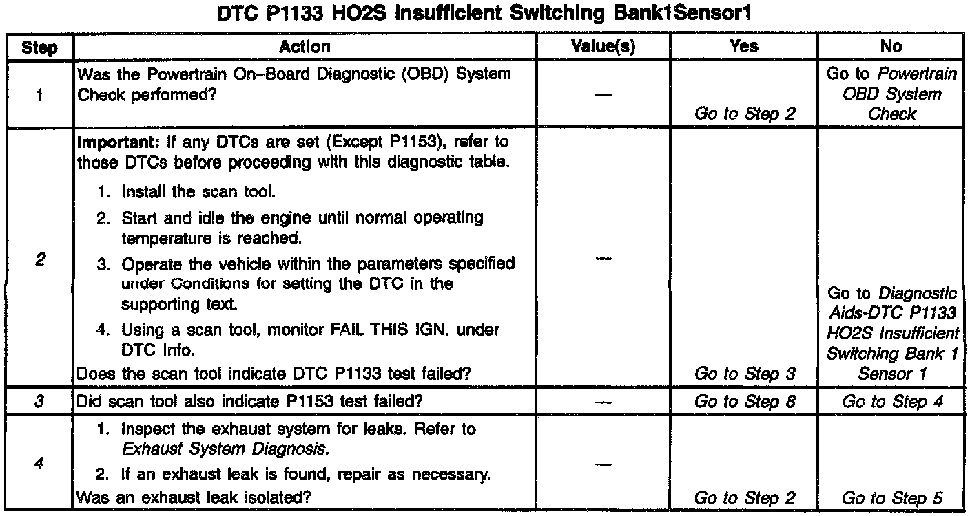The PCM monitors the Heated Oxygen Sensor (HO2S) activity for 100 seconds. During this monitor period the PCM counts the number of times that the HO2S switches form rich to lean and lean to rich. When the PCM determines that the HO2S did not switch enough times, a DTC P1133 will set.
