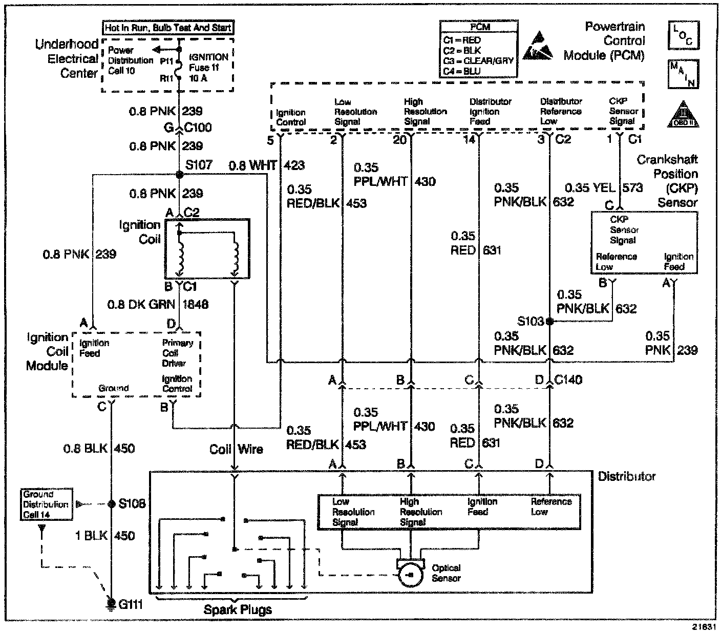 The distributor ignition system supplies two timing inputs to the PCM, a high resolution signal (180 pulses per one crankshaft revolution) and a low resolution signal (4 pulses per one crankshaft revolution). The PCM can determine if one of the timing inputs is not being received by comparing the two inputs. If the PCM detects the high resolution timing pulse without detection the low resolution timing pulse. DTC P1371 will set.