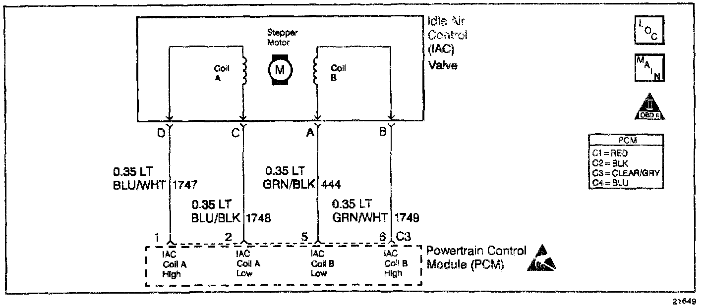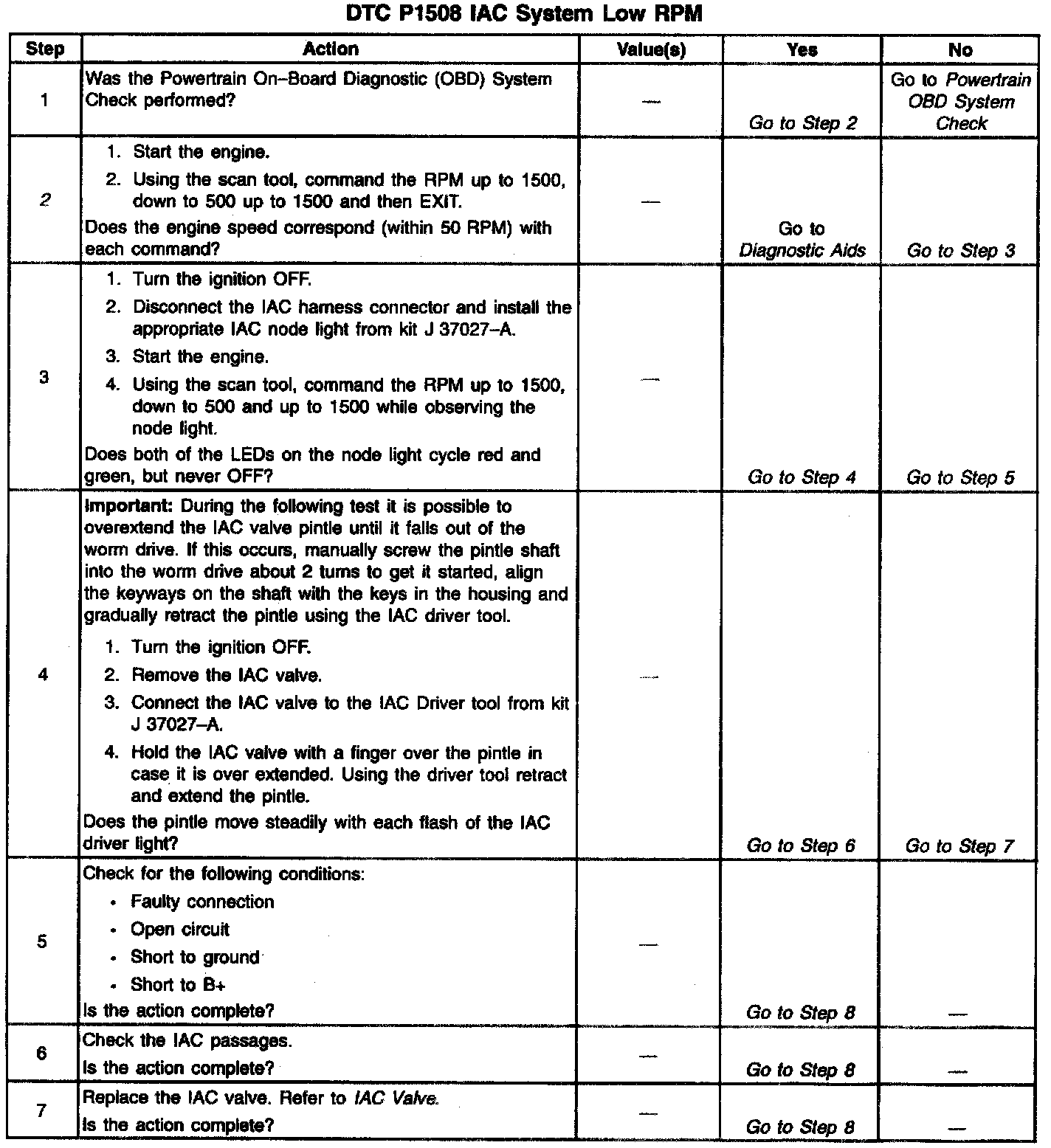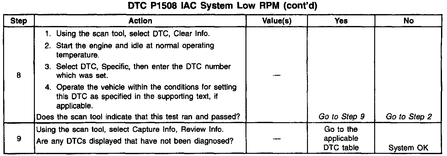 The Idle Air Control (IAC) valve is a PCM controlled stepper motor located on the throttle body. The stepper motor drives a valve pintle which protrudes into a passage that bypasses the throttle plates. To decrease idle speed, the PCM commands the IAC valve pintle to extend. As the pintle approaches its seat, bypass air flow is reduced and idle speed decreases. To increase idle speed, the PCM retracts the IAC valve pintle away from its seat, allowing more air to bypass the throttle plates. One of the PCMs uses for the IAC system is to maintain a desired idle speed, which can vary depending on input to the PCM and other criteria. If the PCM detects engine speed is outside the IAC systems range of control at idle, it will perform an active test while the vehicle is being driven. During this test the PCM commands the IAC valve to move while monitoring Mass Air Flow (MAF). If no change in MAF is detected, the IAC valve is not functioning. If idle RPM was out of IAC System control and the IAC valve does not operate, DTC P1508 is set. If the expected change in MAF had been detected, IAC valve operation would have been verified. Since idle RPM was out of IAC System control but the IAC valve was operational, DTC P0506 would be set.