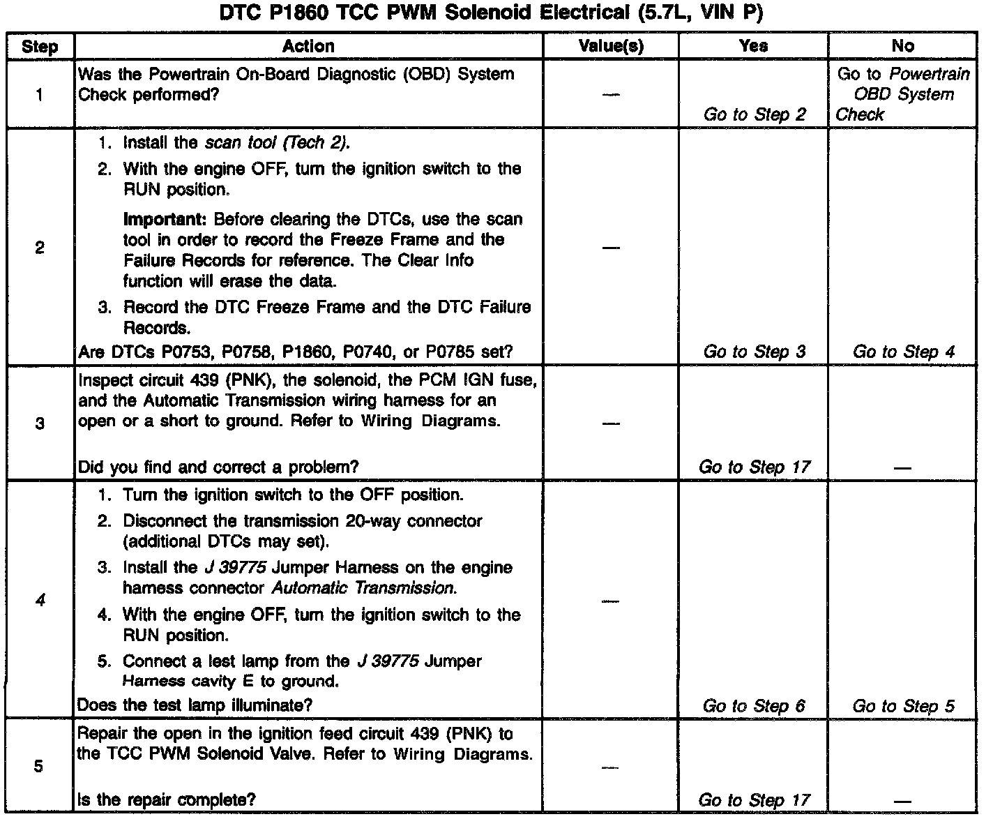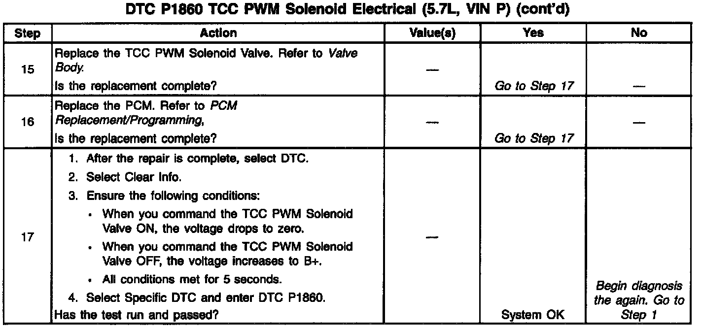 If the PCM detects a continuous open or a short to ground in the TCC PWM circuit or the TCC PWM Solenoid Valve, then DTC P1860 sets. DTC P1860 is a type A DTC.
