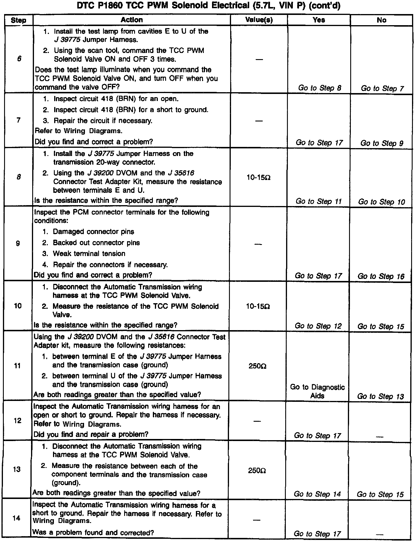 8. This step measures the resistance of the TCC PWM Sol. Valve and the Automatic Transmission wiring harness.
