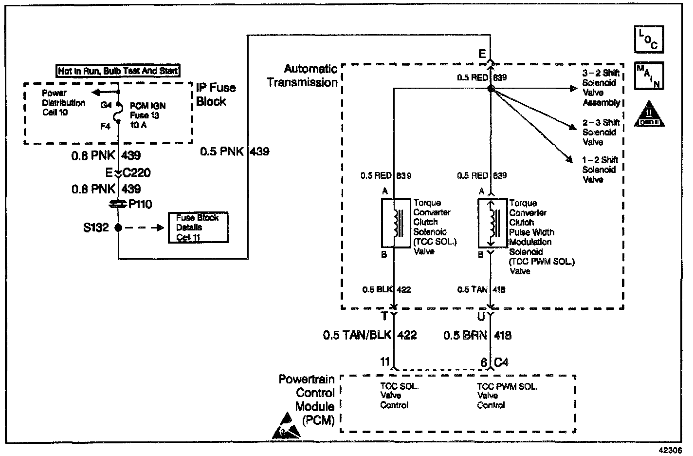 The Torque Converter Clutch (TCC) Pulse Width Modulated (PWM) Solenoid Valve controls the fluid acting on the converter clutch valve, which then controls the application and release of the TCC. The solenoid attaches to the control valve body within the transmission. Circuit 439 supplies ignition voltage directly to the solenoid. The PCM controls the solenoid by providing a ground path on circuit 418. Current flows through the solenoid coil according to the duty cycle (percentage of ON and OFF time). The TCC PWM Solenoid Valve provides a smooth engagement of the torque converter clutch by operating during a duty cycle percent of ON time.