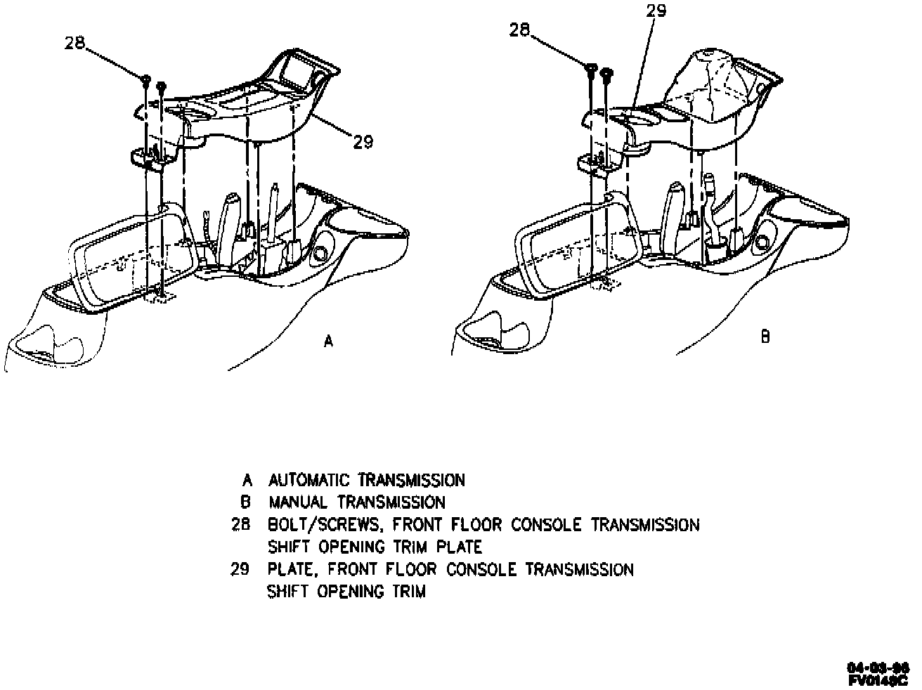 8. Front floor console transmission shift opening trim plate bolts/screws (28).