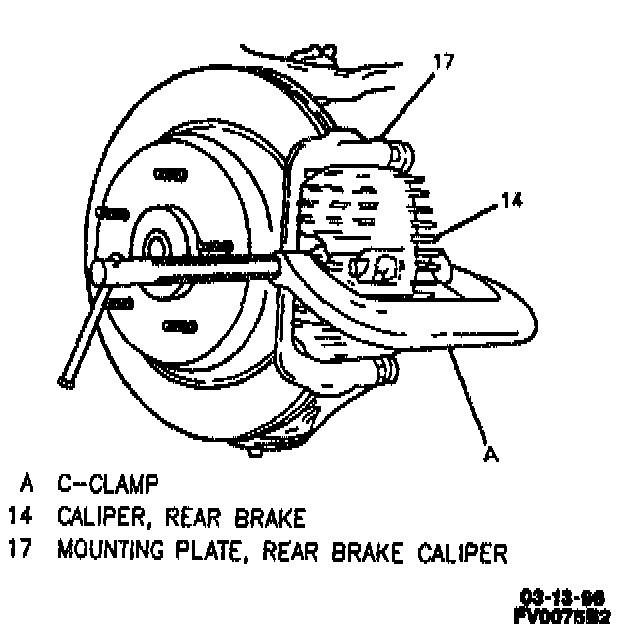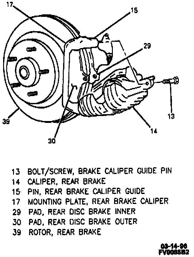 7. Brake pad anti-squeal shim (10). Discard anti-squeal shim (10). Clean All residue from shoe guide surfaces on caliper mounting plate (17) and rear brake caliper (14). Inspect Caliper guide pins (153 for free movement in caliper mounting plate (17). Inspect Caliper guide pin boot (16) for proper seating in retaining groove of guide pin (15) and caliper mounting plate (17). Replace caliper guide pins (15) or guide pin boots (16) if corroded or damaged. Refer to Rear Brake Caliper Replacement.
