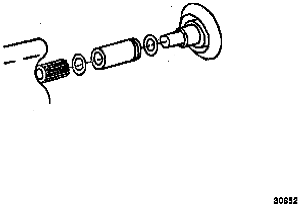 ^ With the nut and the thrust washer installed to the end of the putter screw threads, index the pilot in the camshaft front bearing and install the puller screw through the pilot and the bearing to be removed.