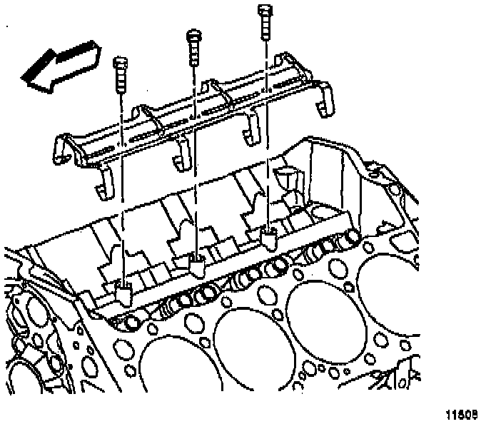 ^ Install the three 5/16-18 x 4.0 inch bolts in the camshaft front bolt hoses.