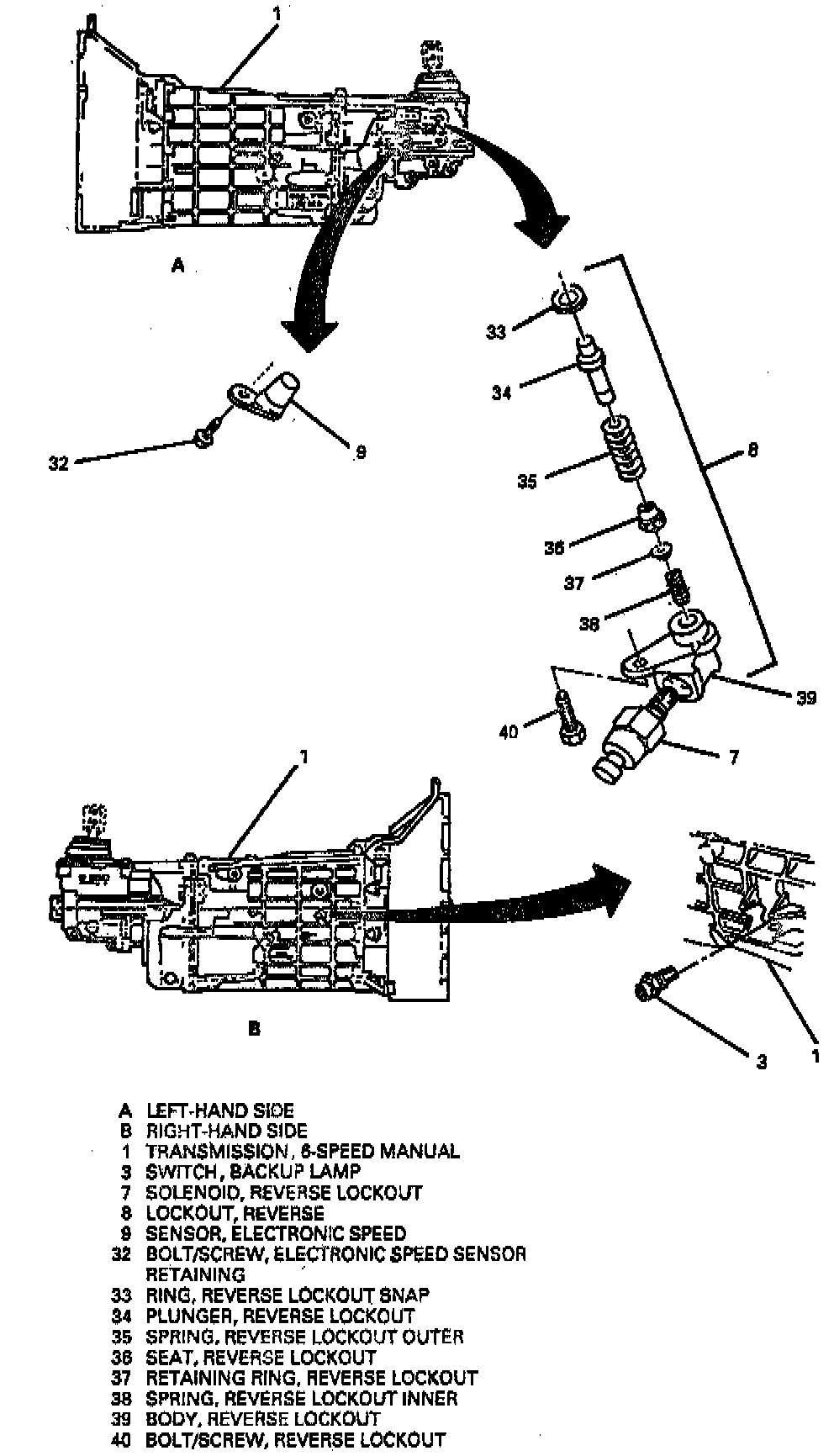 The backup lamp switch is located on the left-hand side of the 5-speed manual transmission, while the backup lamp switch on the 6-speed manual transmission is located on the right-hand side.REMOVE OR DISCONNECT