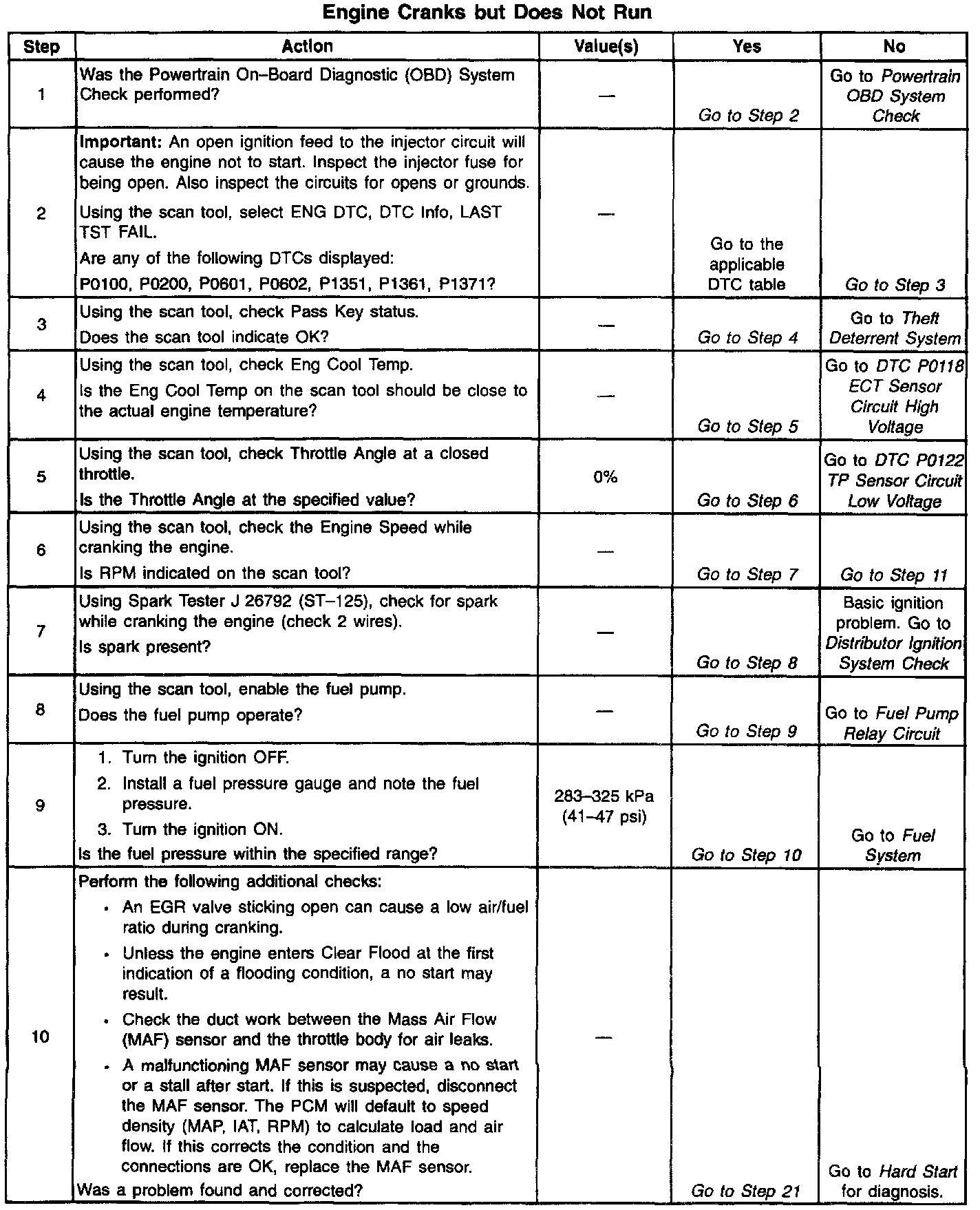 This table assumes that battery condition and engine cranking speed are OK. If not, refer to Engine Electrical for diagnosis. Also, make sure that there is adequate fuel in the tank.