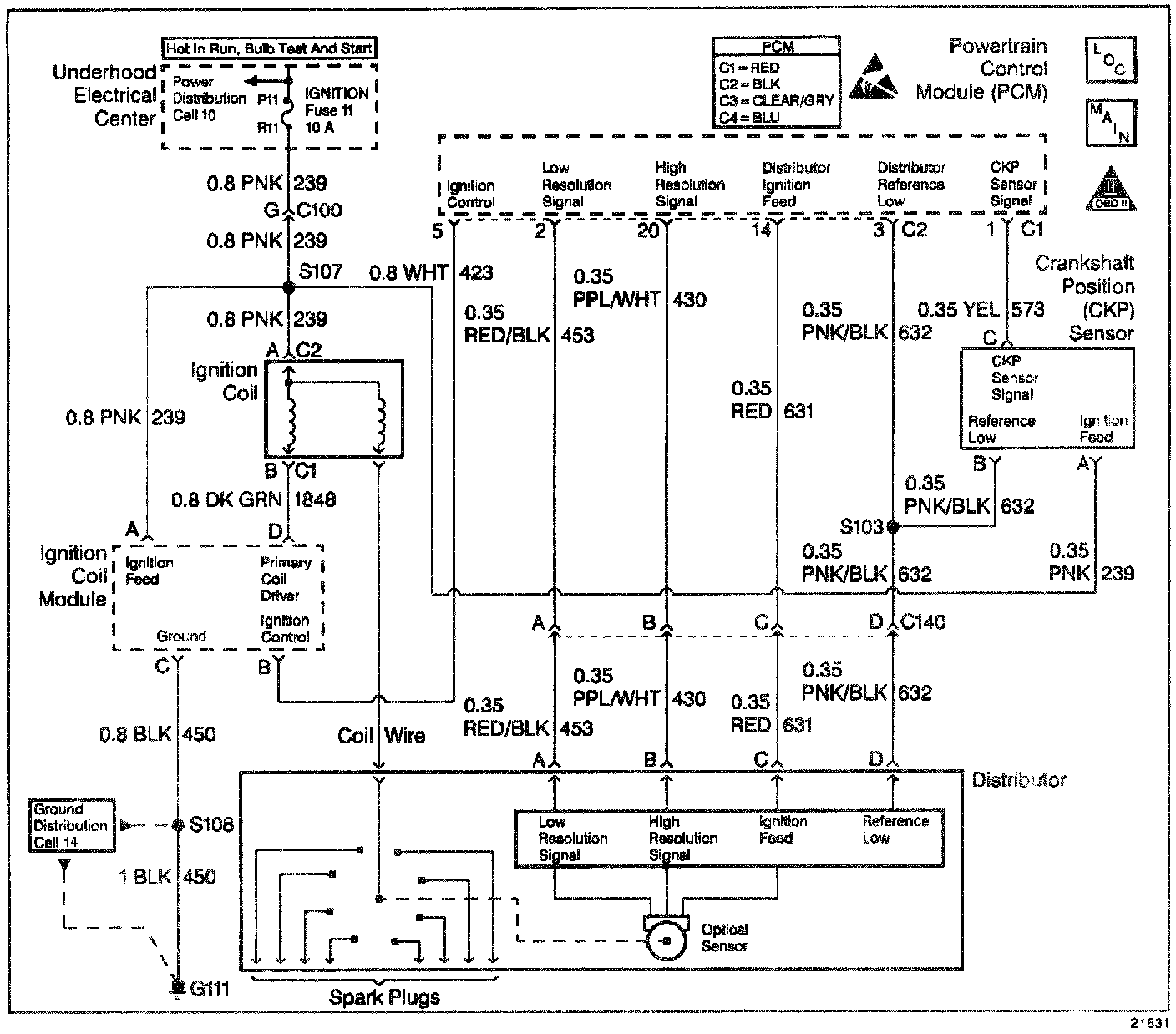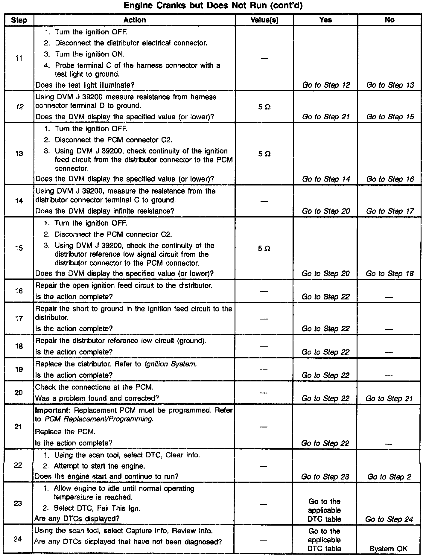 12. If no RPM was indicated on the scan tool during cranking, the power and ground to the distributor from the PCM are both OK, and DTC P1371-D1 Low Resolution Circuit is not set, replace the PCM