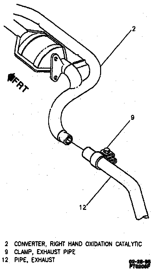 6. Loosen clamp (9) attaching left side catalytic converter (2) to exhaust pipe (12) and reposition.
