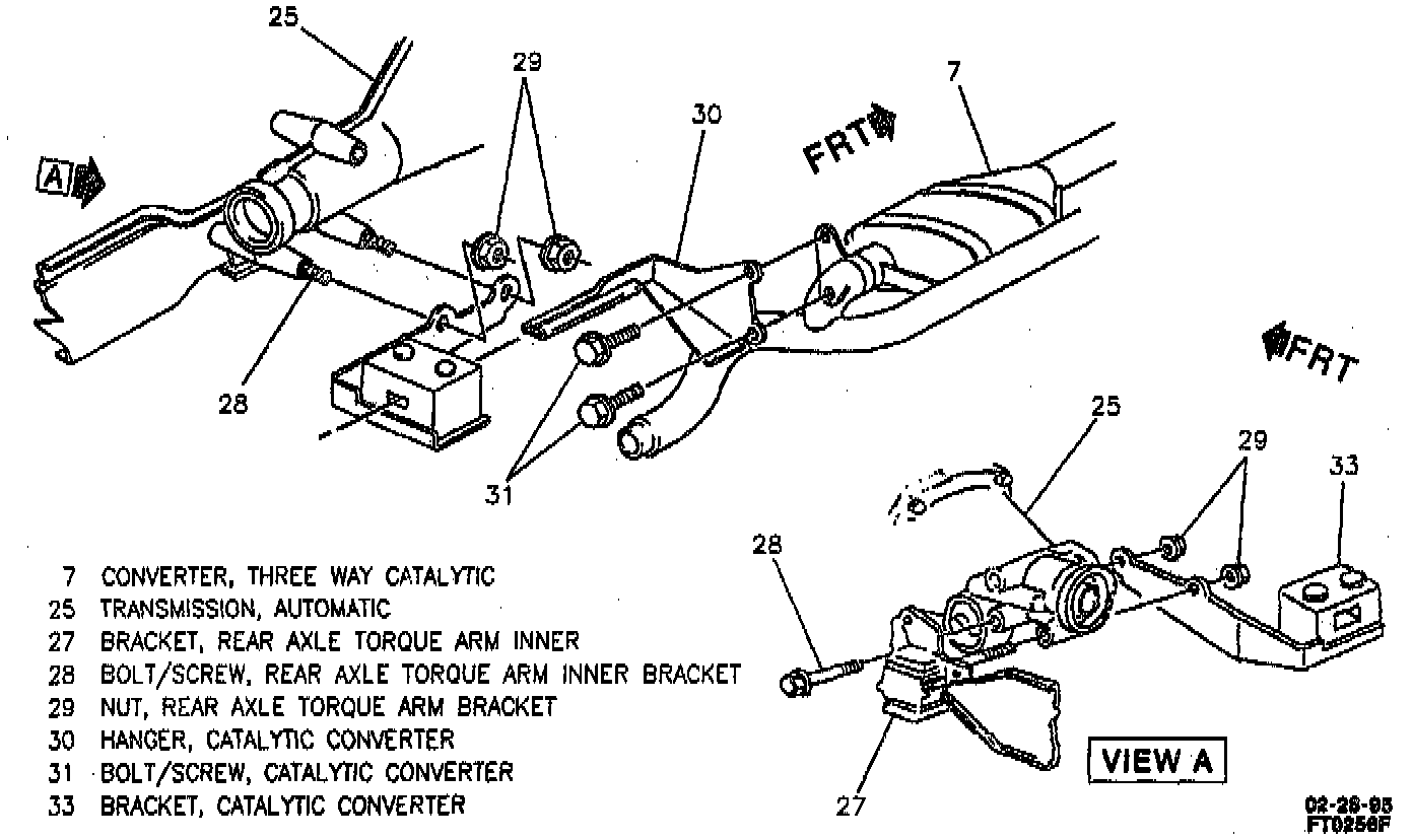 2. Heated oxygen sensor electrical connector and disconnect rosebud clip from catalytic converter hanger bracket.