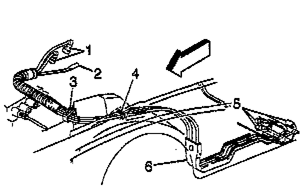 3. Install the fuel feed, return, and EVAP pipes into the underbody retainer (6).