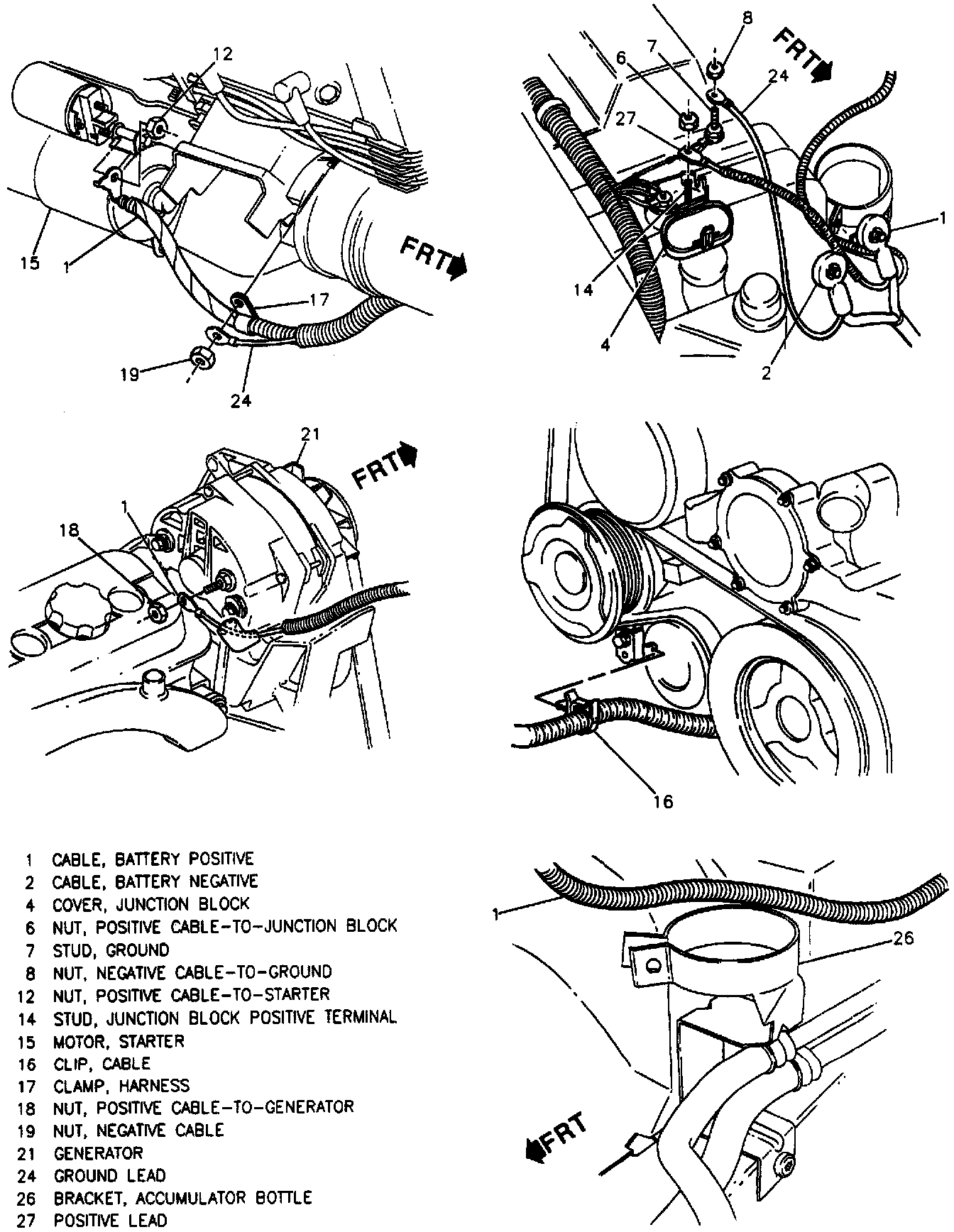 6. Negative cable nut (19) securing positive cable (I) and harness clip (17) to engine stud.