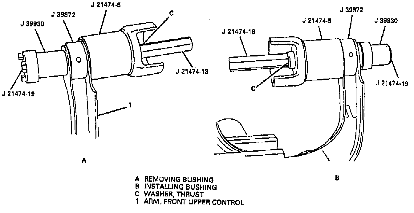 B. Install new upper control arm bushing onto J 21474-19 with three indentations facing toward three tangs on J 39930.
