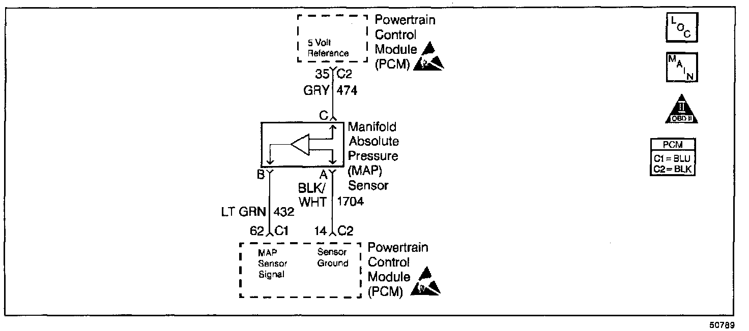 The Manifold Absolute Pressure (MAP) sensor measures the changes in the intake manifold pressure which result from engine load (intake manifold vacuum) and RPM changes; and converts these into a voltage output. The Powertrain Control Module (PCM) sends a 5 volt reference voltage to the MAP sensor. As the manifold pressure changes, the output voltage of the sensor also changes. By monitoring the sensor output voltage, the PCM knows the manifold pressure. A lower pressure (low voltage) output voltage will be about 1.0 to 1.5 volts at idle. While higher pressure (high voltage) output voltage will be about 4.5 to 4.8 at Wide Open Throttle (WOT). The MAP sensor is also used, under certain conditions, to measure barometric pressure, allowing the PCM to make adjustments for different altitudes. The PCM uses the MAP sensor to control fuel delivery and ignition timing.
