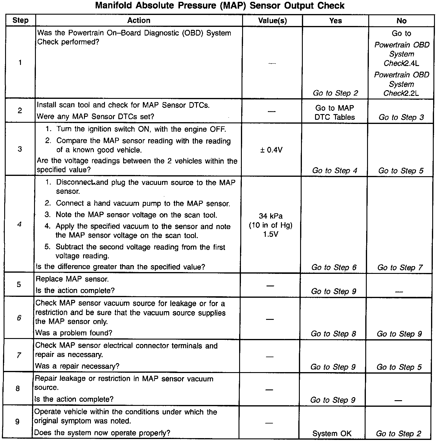 4. Applying 34 kPa (10 in of Hg) vacuum to the MAP sensor should cause the voltage to be 1.5 to 2.1 volts less than the voltage at Step 3. Upon applying vacuum to the sensor, the change in voltage should be instantaneous. A slow voltage change indicates a malfunctioning sensor.