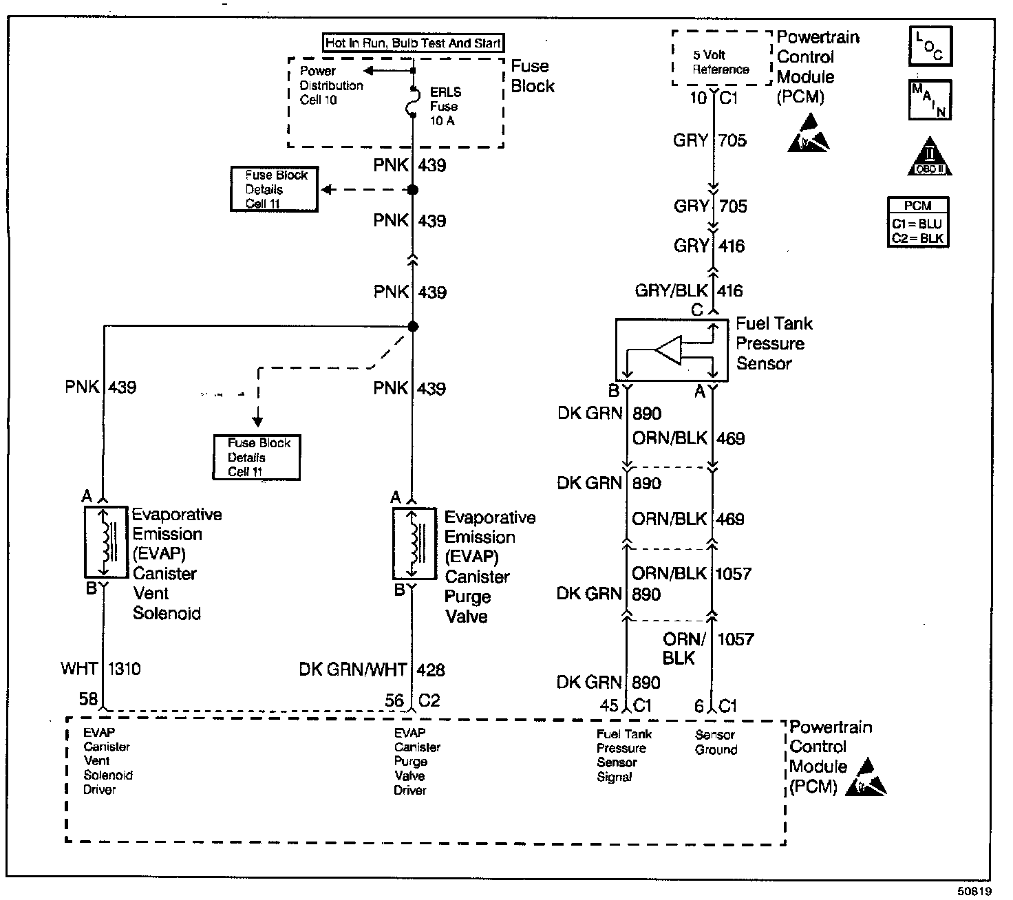 ^ Fuel tank pressure sensor operation is covered here and diagnosed in DTCs P0440, P0442, P0446, P1441 and Evaporative Emission System Check.