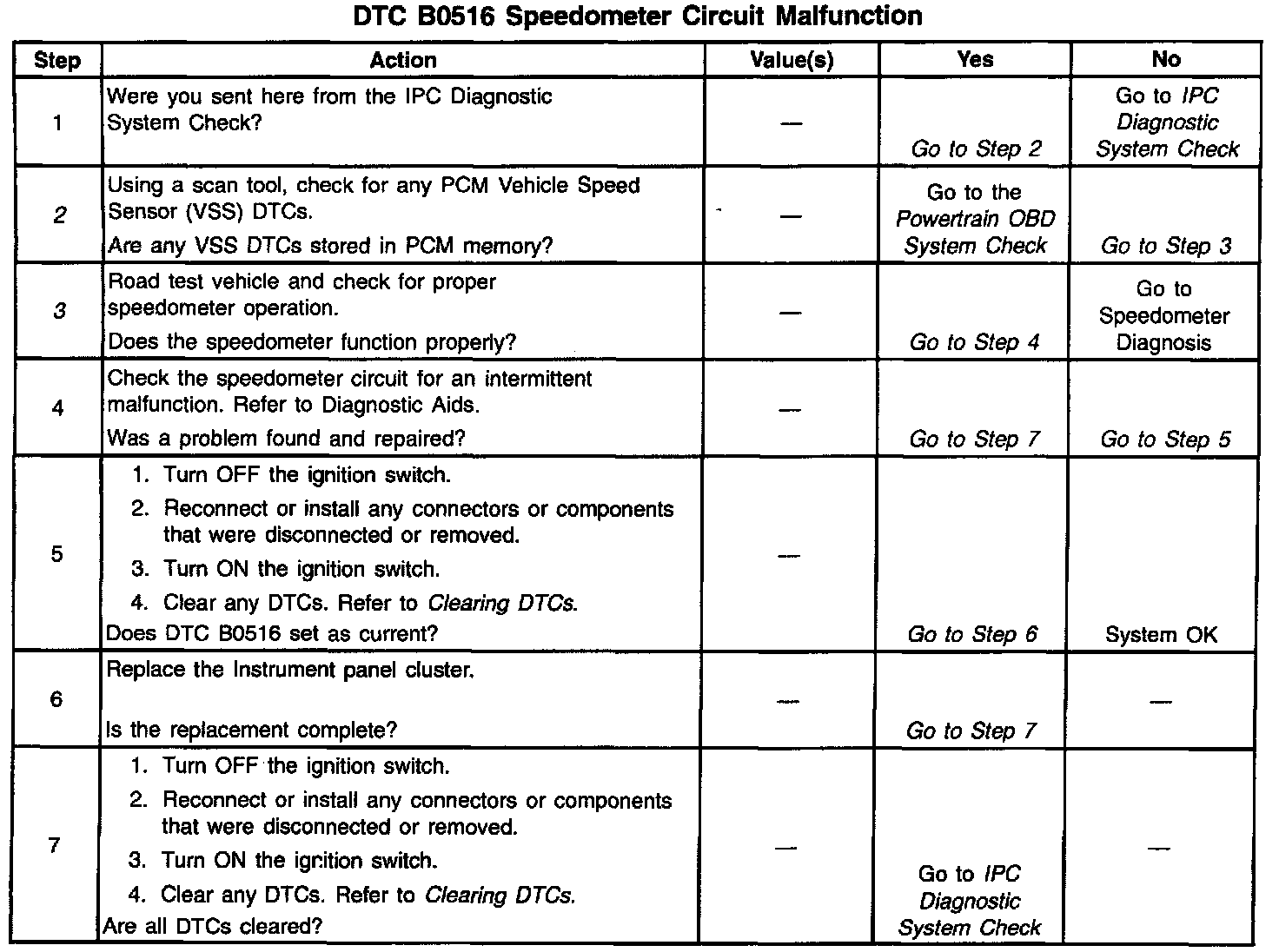 3. This test checks for proper speedometer operation. A speedometer malfunction will cause a B0516 to set in the IPC memory. Always diagnose and correct any speedometer malfunctions before diagnosing a B0516.
