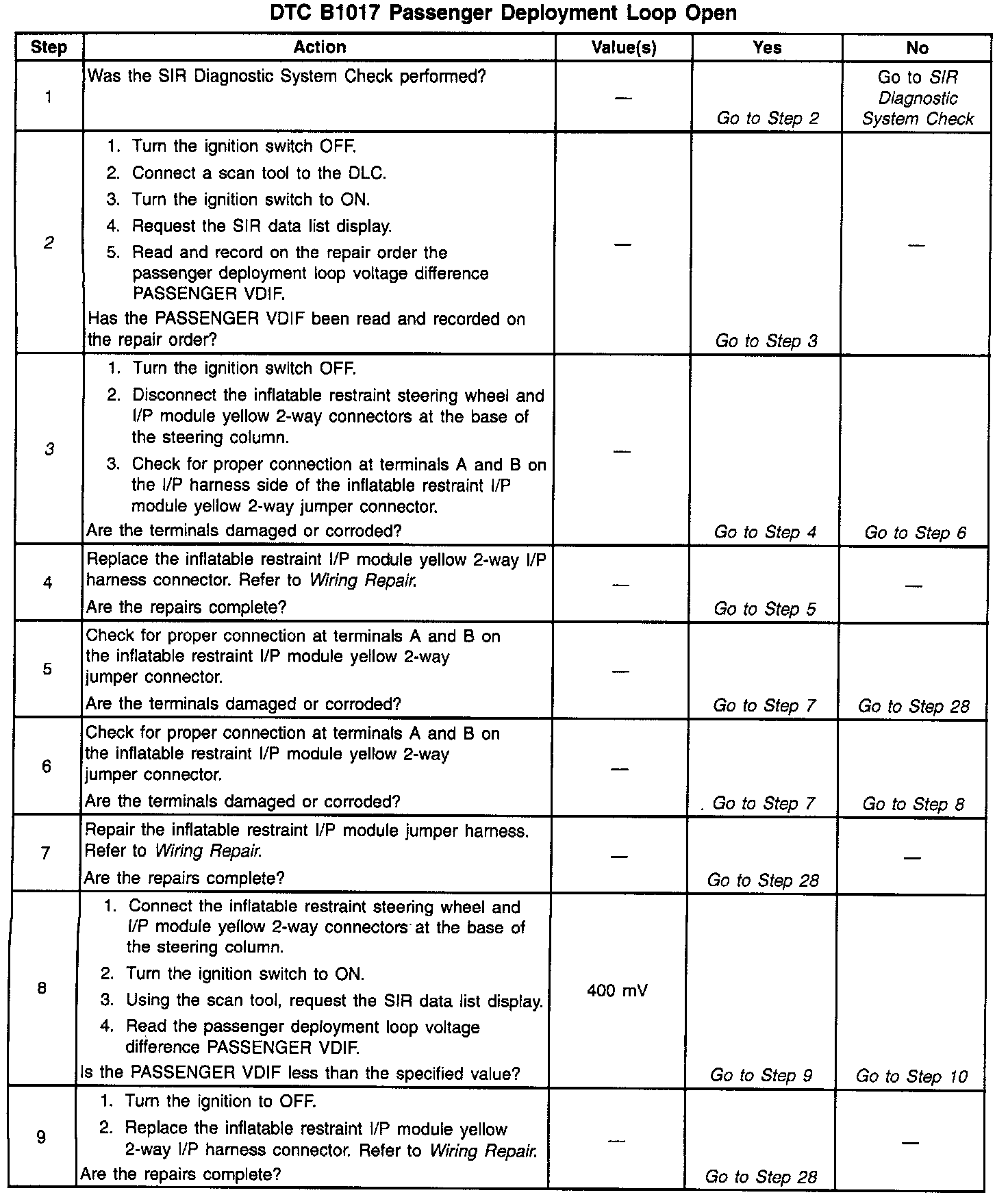 - A poor connection at the inflatable restraint I/P module harness connector terminals A and B.