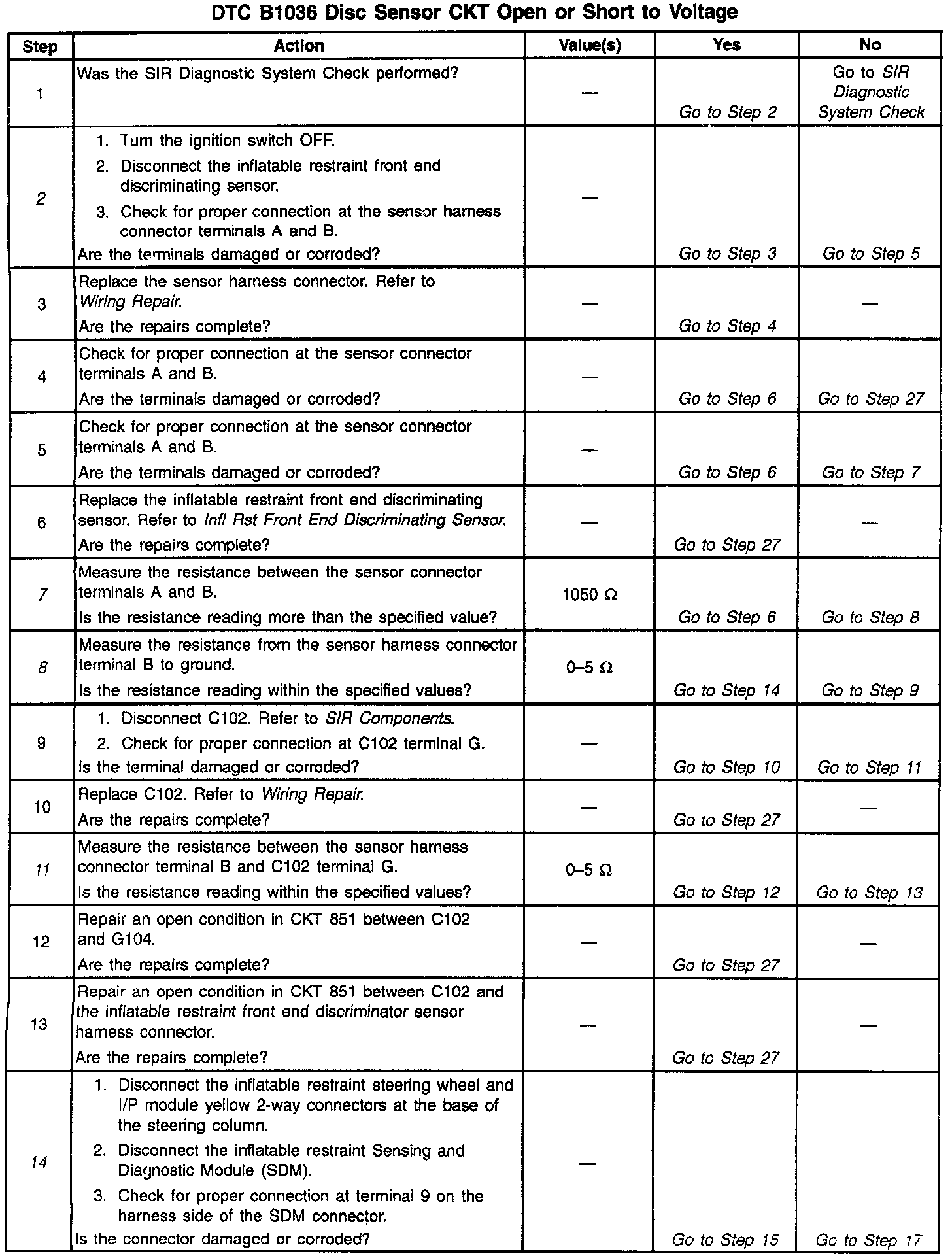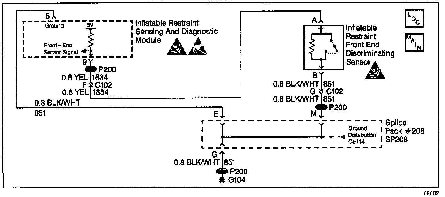 A broken or chafed wire in the inflatable restraint front end discriminating sensor circuit can cause an intermittent condition. Inspect CKT 1834 and CKT 851 carefully for cutting or chafing.