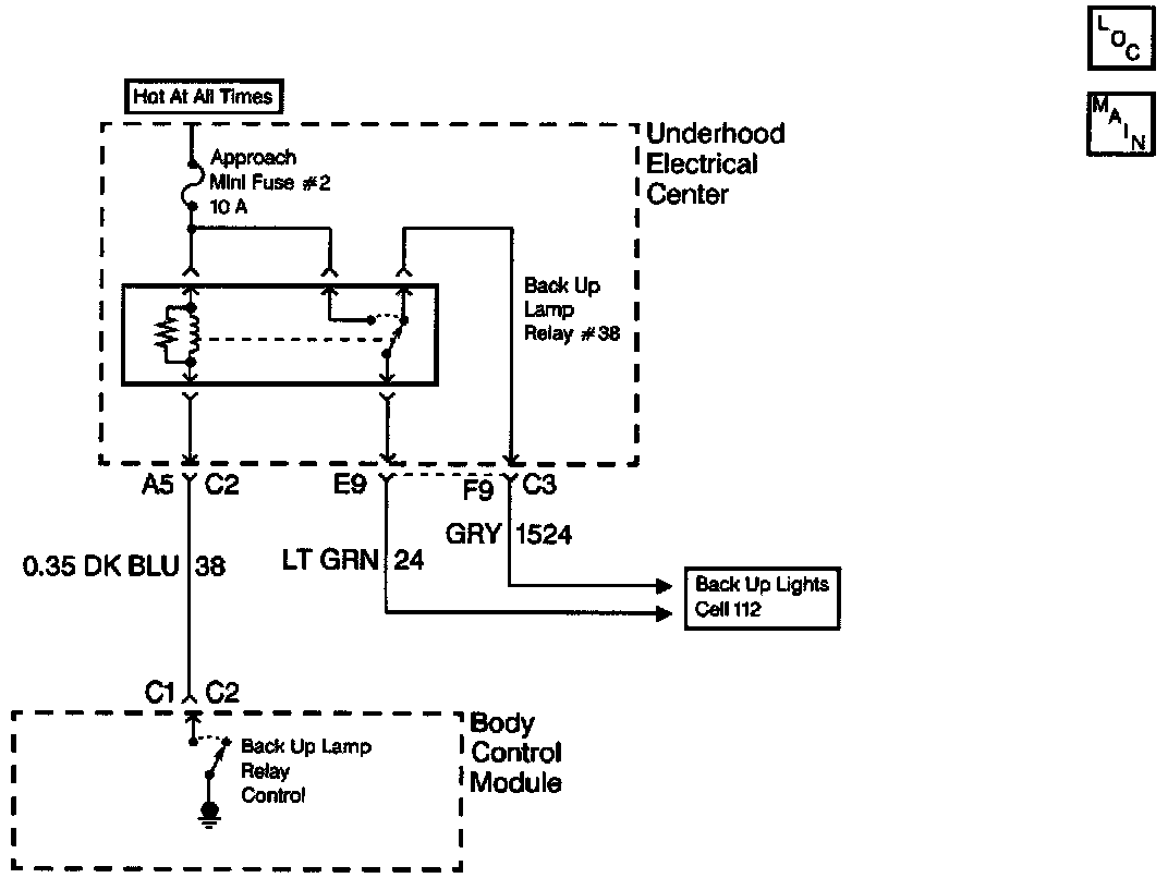 ^ If CKT 38 is shorted to ground, the backup lamp will remain ON at all times. If CKT 38 is open, the backup lamp will remain OFF at all times.