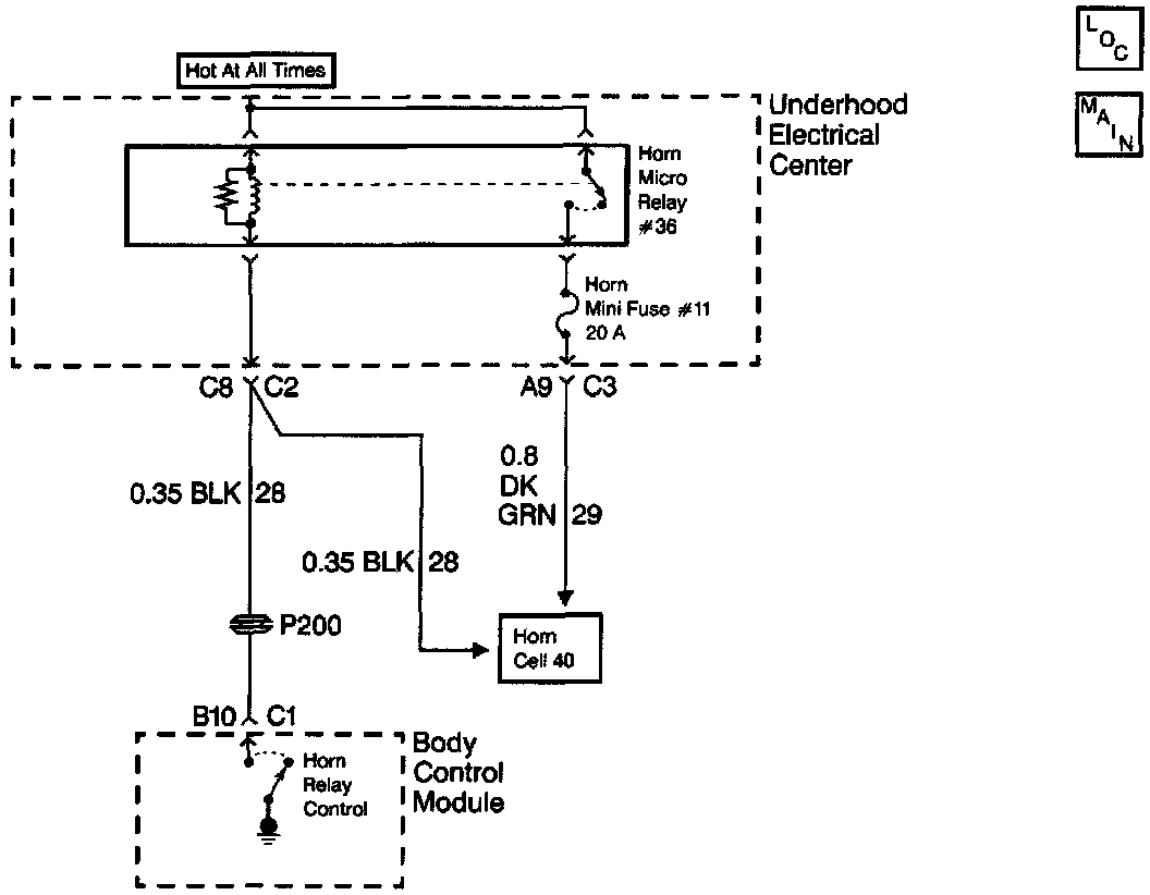 ^ If CKT 28 is shorted to ground, the horn will remain ON at all times. If CKT 28 is open, the horn will remain OFF at all times.