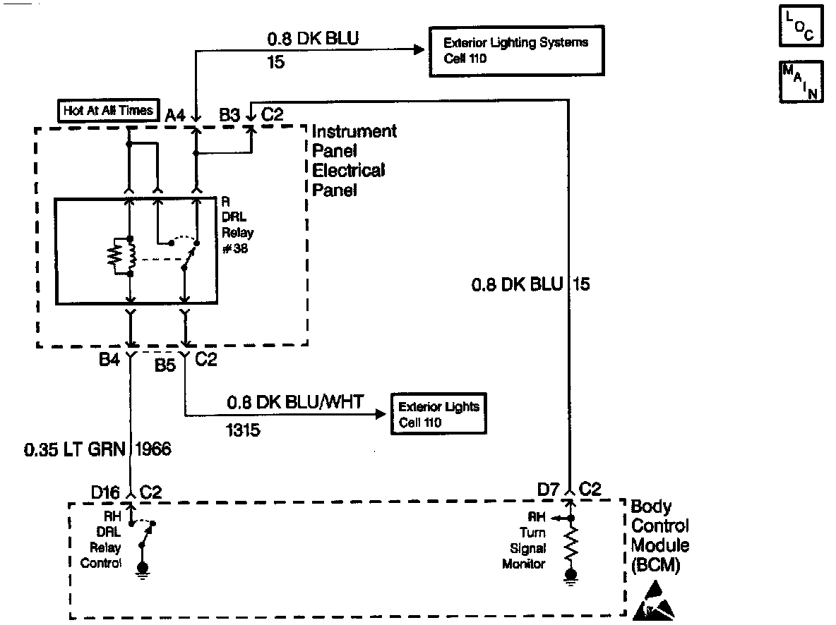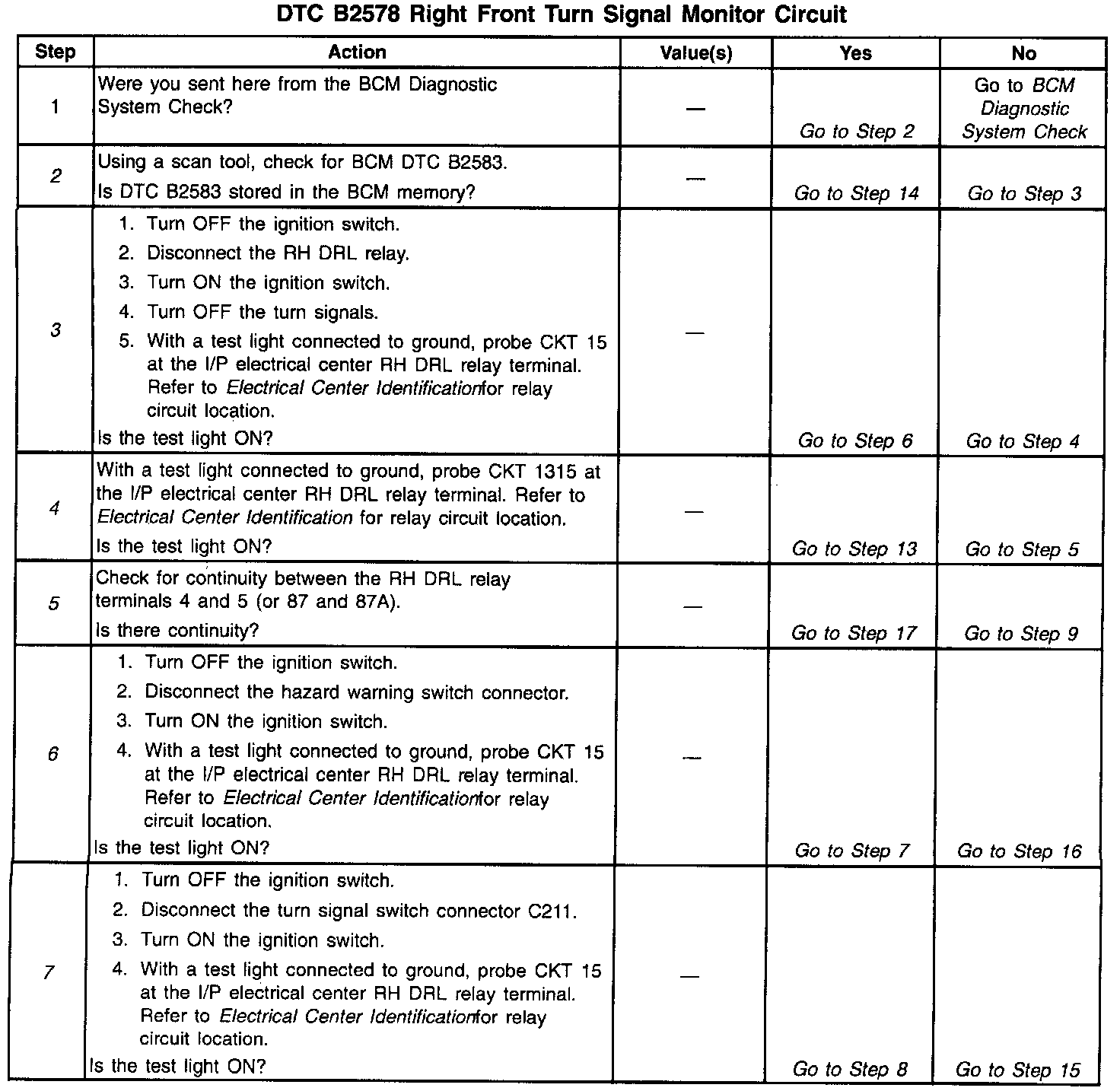 ^ The BCM needs to detect voltage oscillations on CKT 15 in order to de-energize the RF turn signal relay. If the BCM detects continuous voltage on CKT 15, the BCM interprets this as a short to voltage. The BCM will continue with normal DRL operation, and the RF turn signal will remain inoperative.