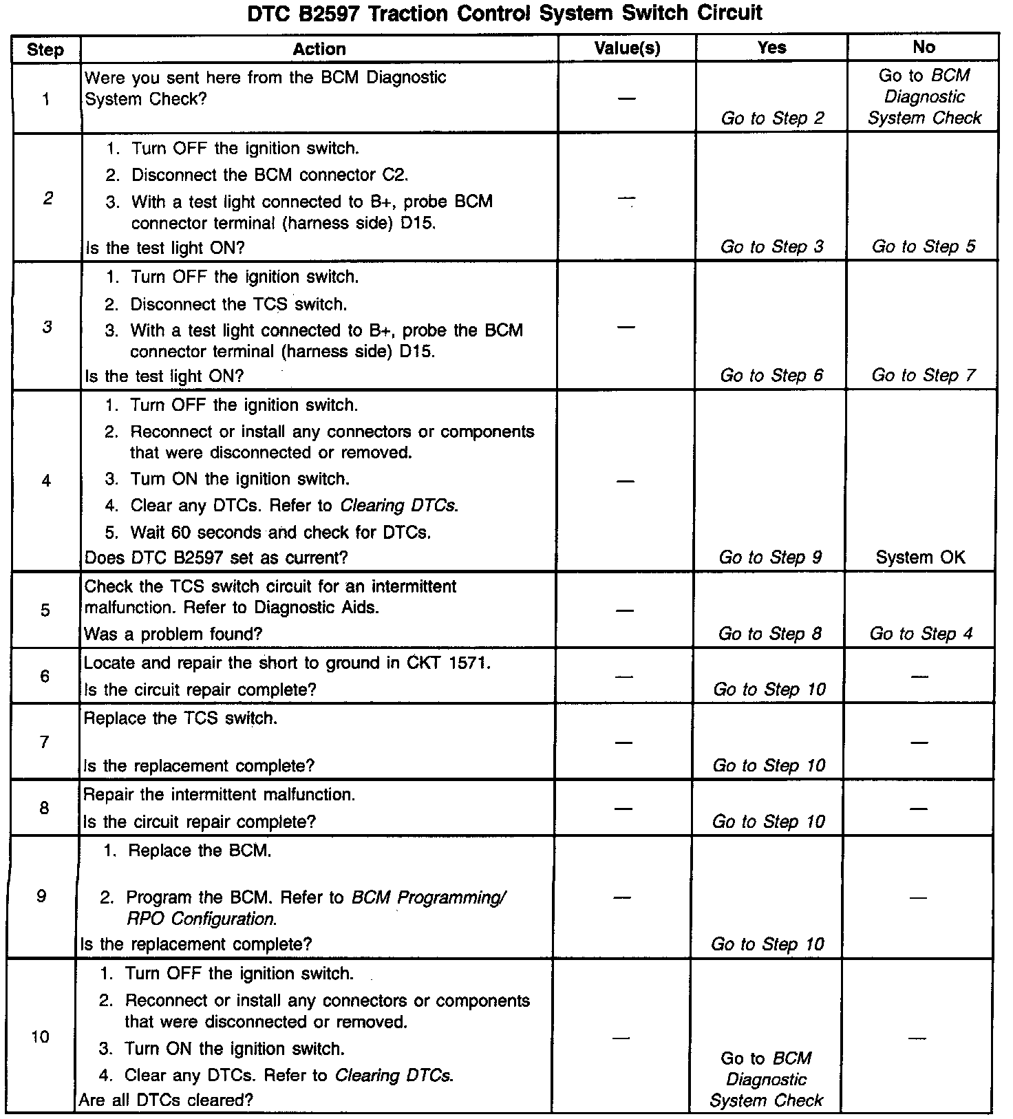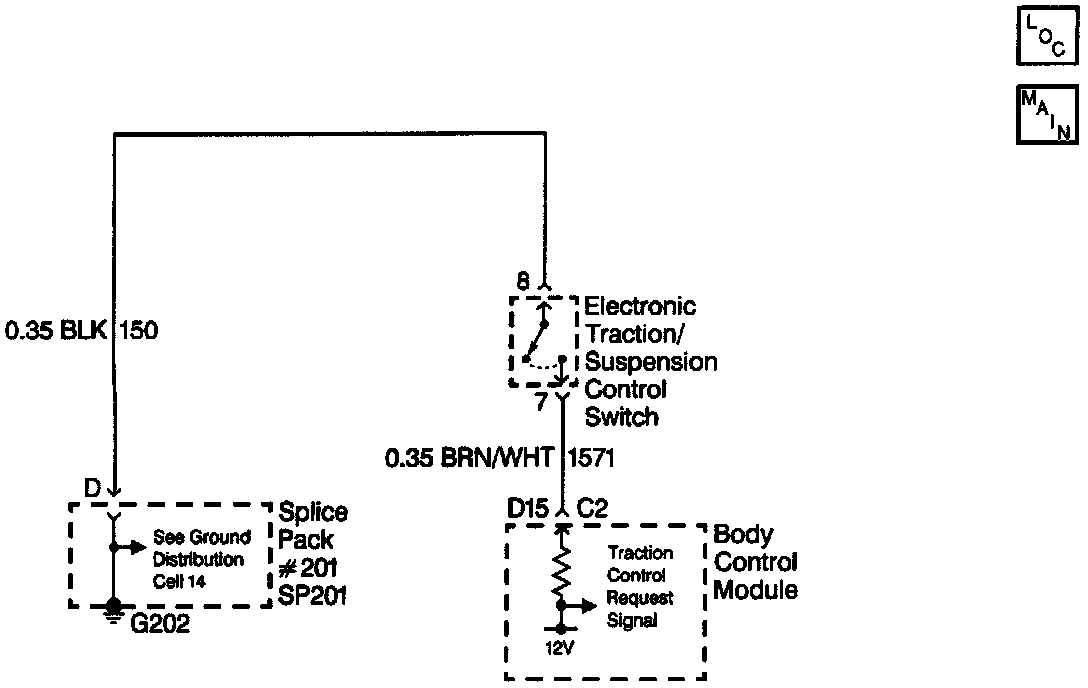 The TCS switch circuit provides a ground input to the BCM when the switch is pressed. This input allows the BCM to detect a TCS ON or OFF request. If the BCM detects a ground on CKT 1571 with the TCS OFF, the BCM will send a message on the serial data line to the EBTCM to turn ON the TCS. If the BCM detects a ground after the TCS is ON, the BCM will send a second message to the EBTCM to turn OFF the TCS. The BCM monitors the TCS switch circuit and determines how long a ground has been applied. If the ground is applied for longer than expected, a malfunction is present and a DTC will set.